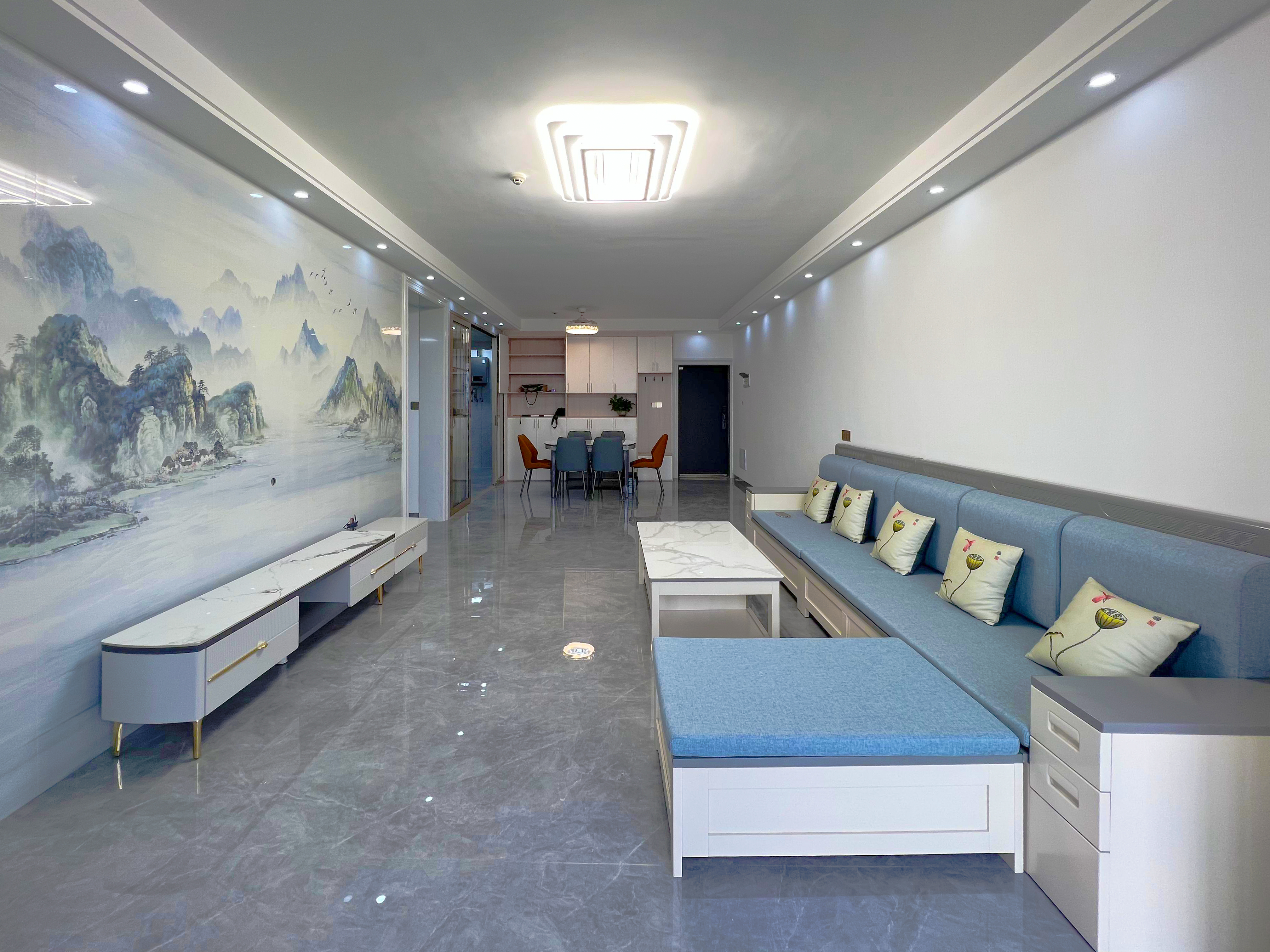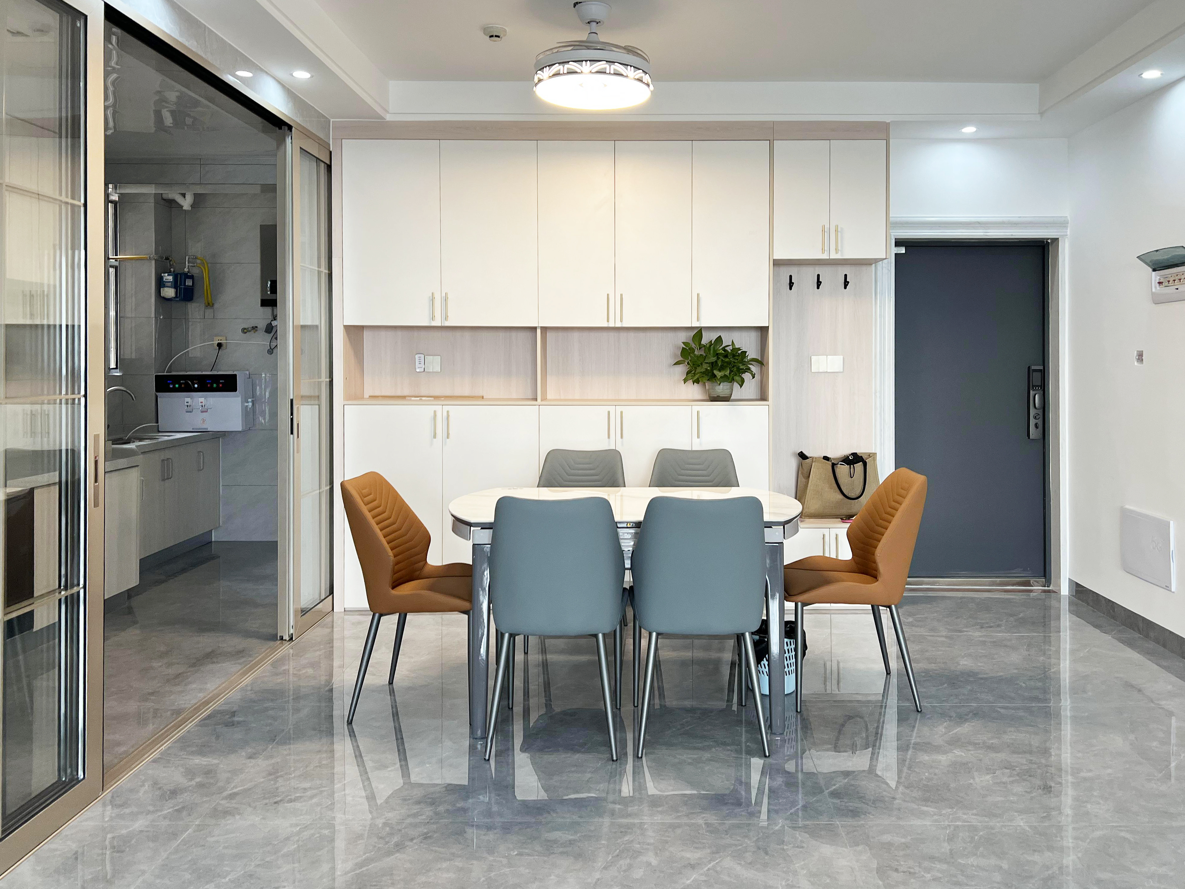 餐廳兩側(cè)都有收納柜,相當(dāng)于在兩邊都做有收納,完美解決了餐廳雜物問(wèn)題,頂部燈光直射餐桌,提前預(yù)設(shè)的燈光能增加整體的就餐氛圍,桌椅的跳色選擇有讓人眼前一亮的驚喜,摒棄單調(diào)。
