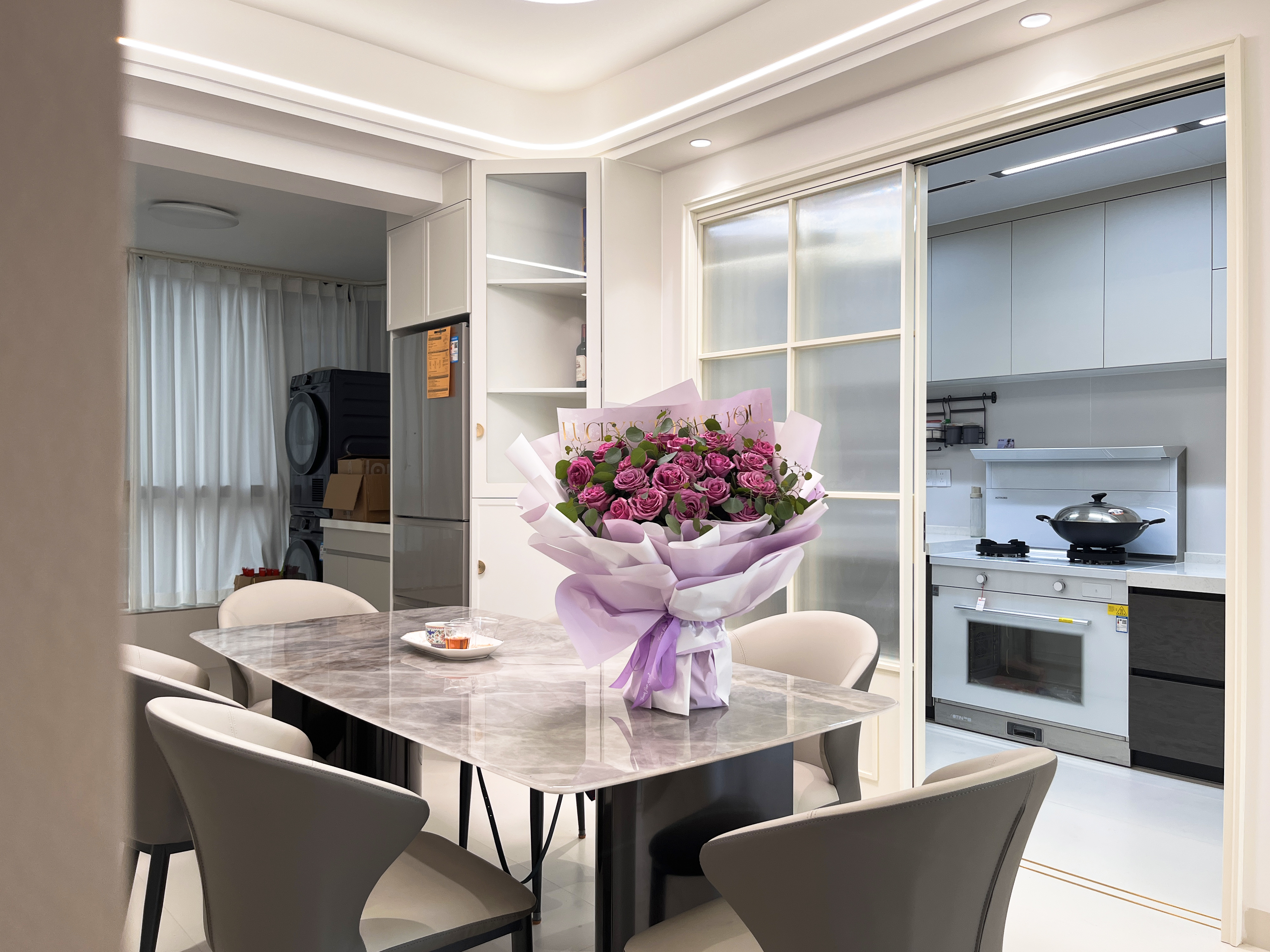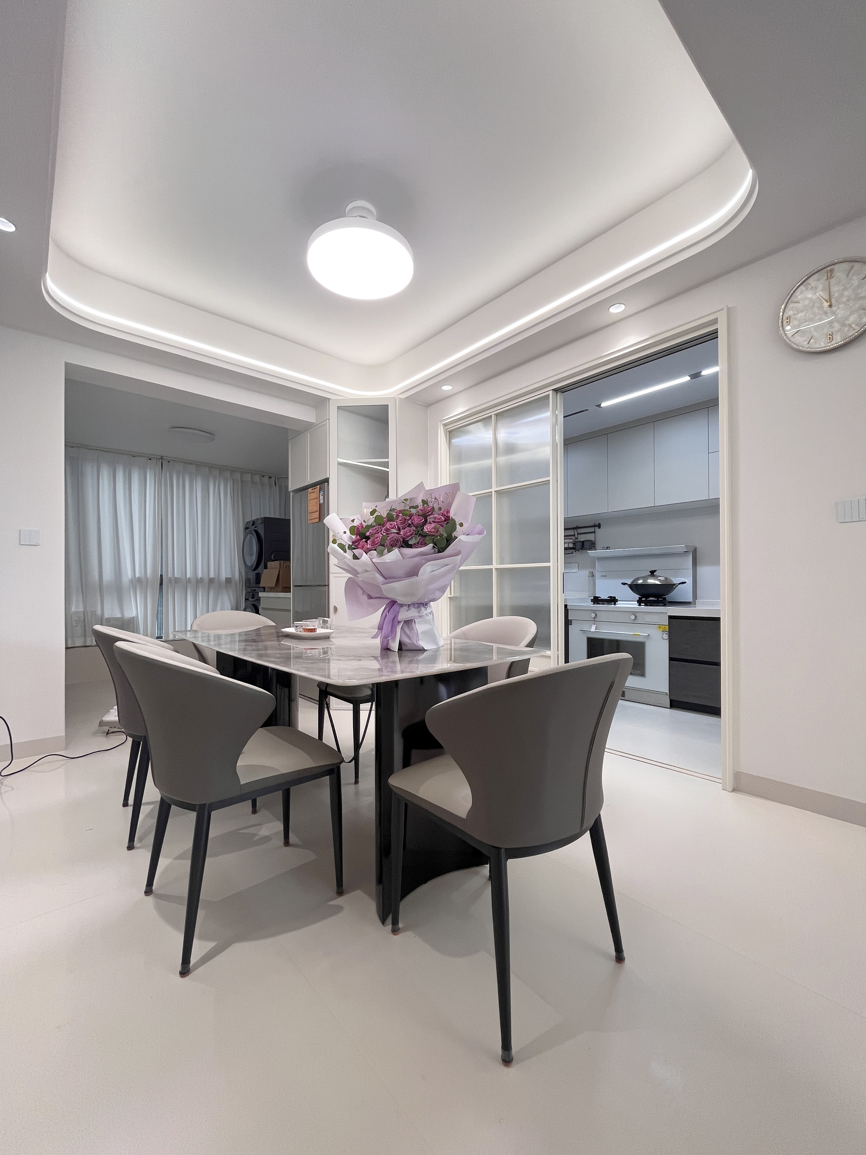 餐廳位置頂上做了專屬空間的吊頂,和客廳形成邊界,在原來的基礎(chǔ)上增加了立體空間感,選擇一個(gè)長(zhǎng)桌做軟裝的布置,很大程度增加了家里人走動(dòng)的公共空間,主燈燈光落下,能很好的營(yíng)造空間的氛圍感。