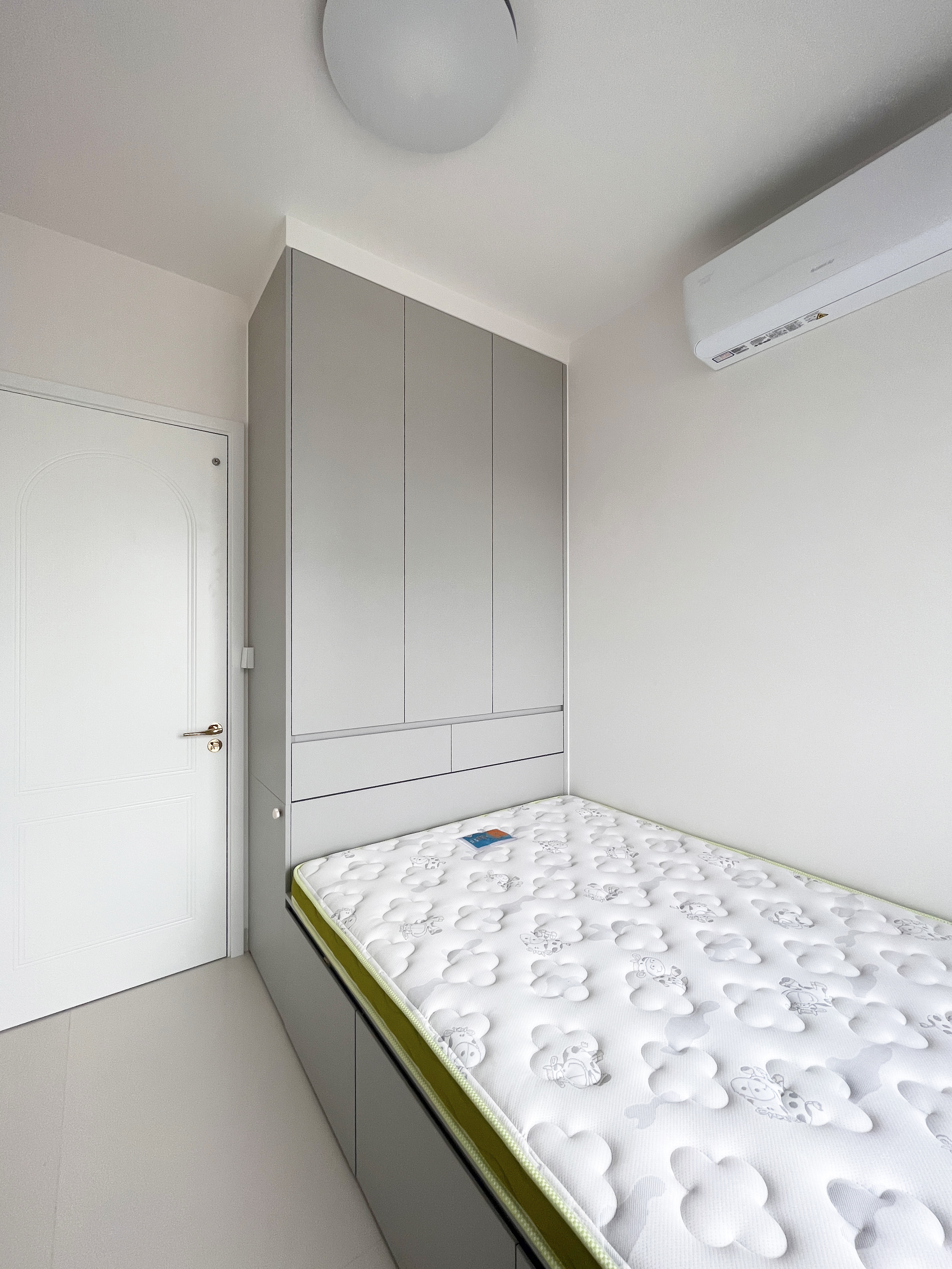 次臥空間更多的考慮了如何把收納空間做的更合理有效,因?yàn)楸旧淼目臻g相對(duì)來說是比較少的,所以在次臥的設(shè)計(jì)上實(shí)現(xiàn)了不同房間的不同風(fēng)格,并保證了走動(dòng)空間的寬度,舒適且自在。