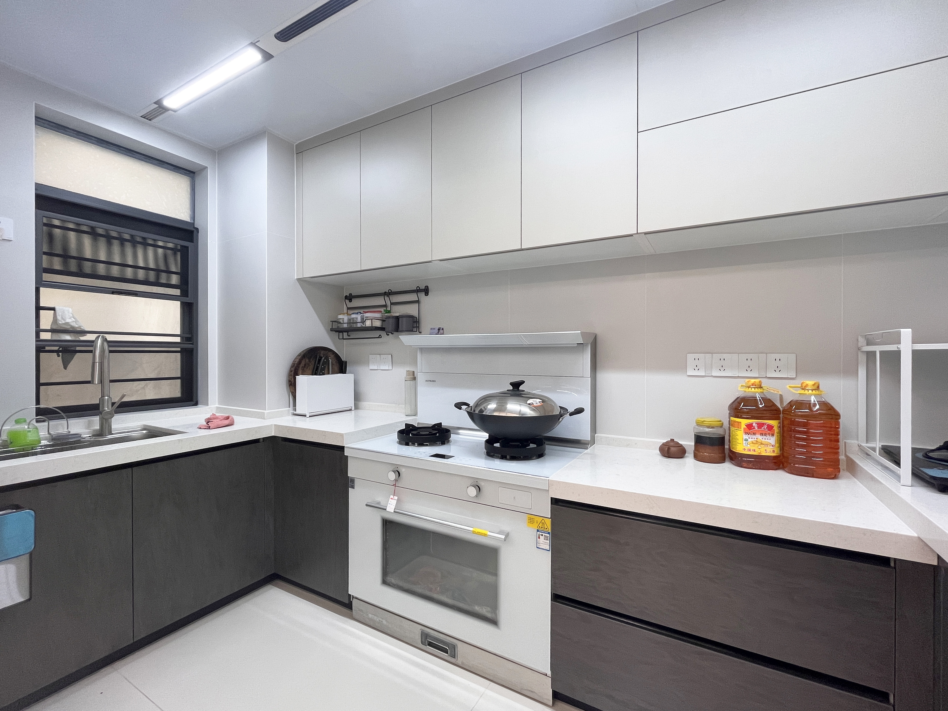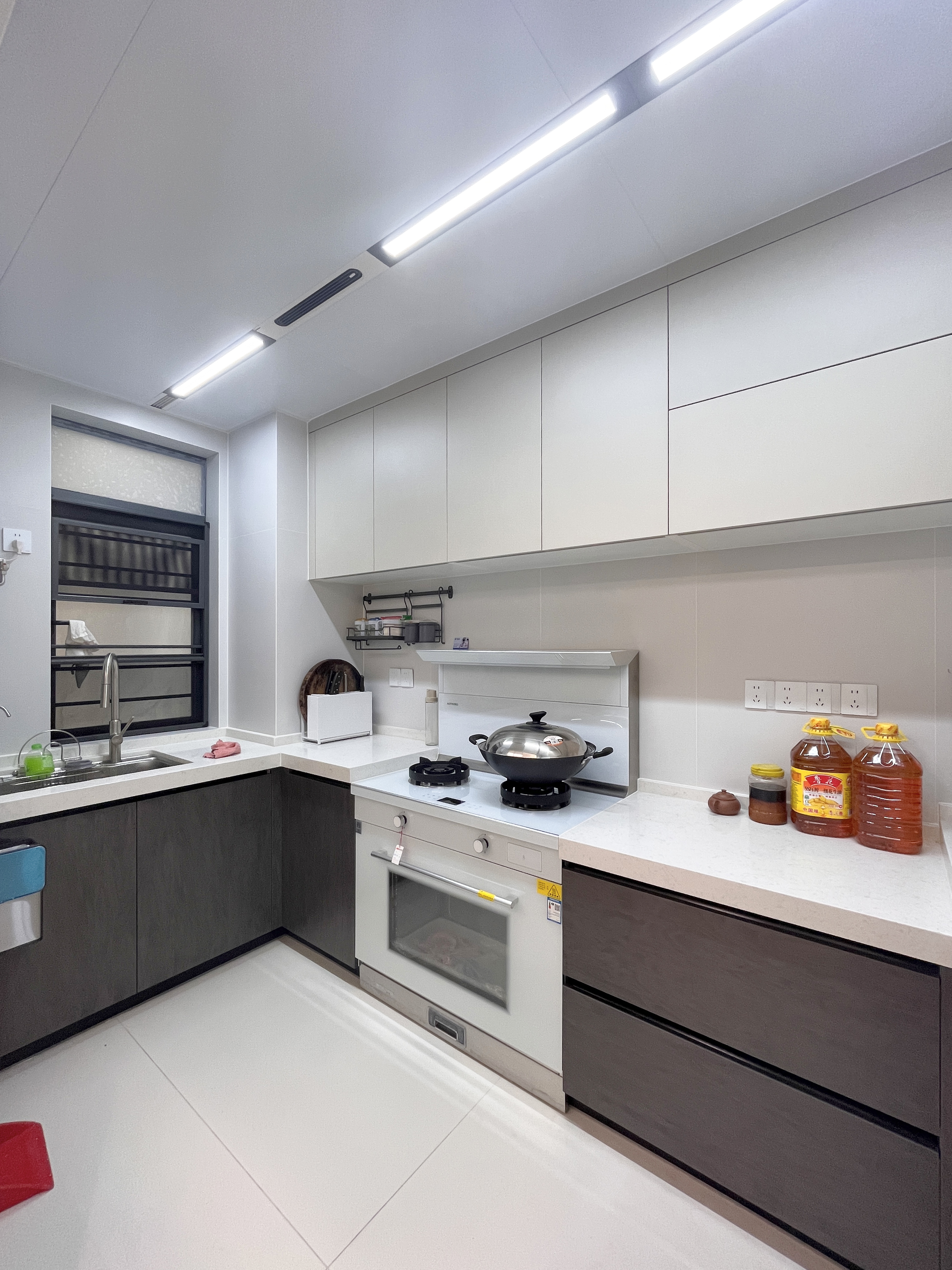 廚房推拉門的選擇跟整體的色調(diào)很呼應(yīng),一扇門隔開一個(gè)油煙空間,保證油煙不外竄。廚房?jī)?nèi)部色調(diào)上的搭配除了盡可能與整體風(fēng)格搭配以外,還選擇了相對(duì)來水比較耐臟的櫥柜顏色,下面部分如果有了水漬也比較容易清理,而上部分的櫥柜則是能最大限度地與公共空間融合,增加視覺上的空間感。