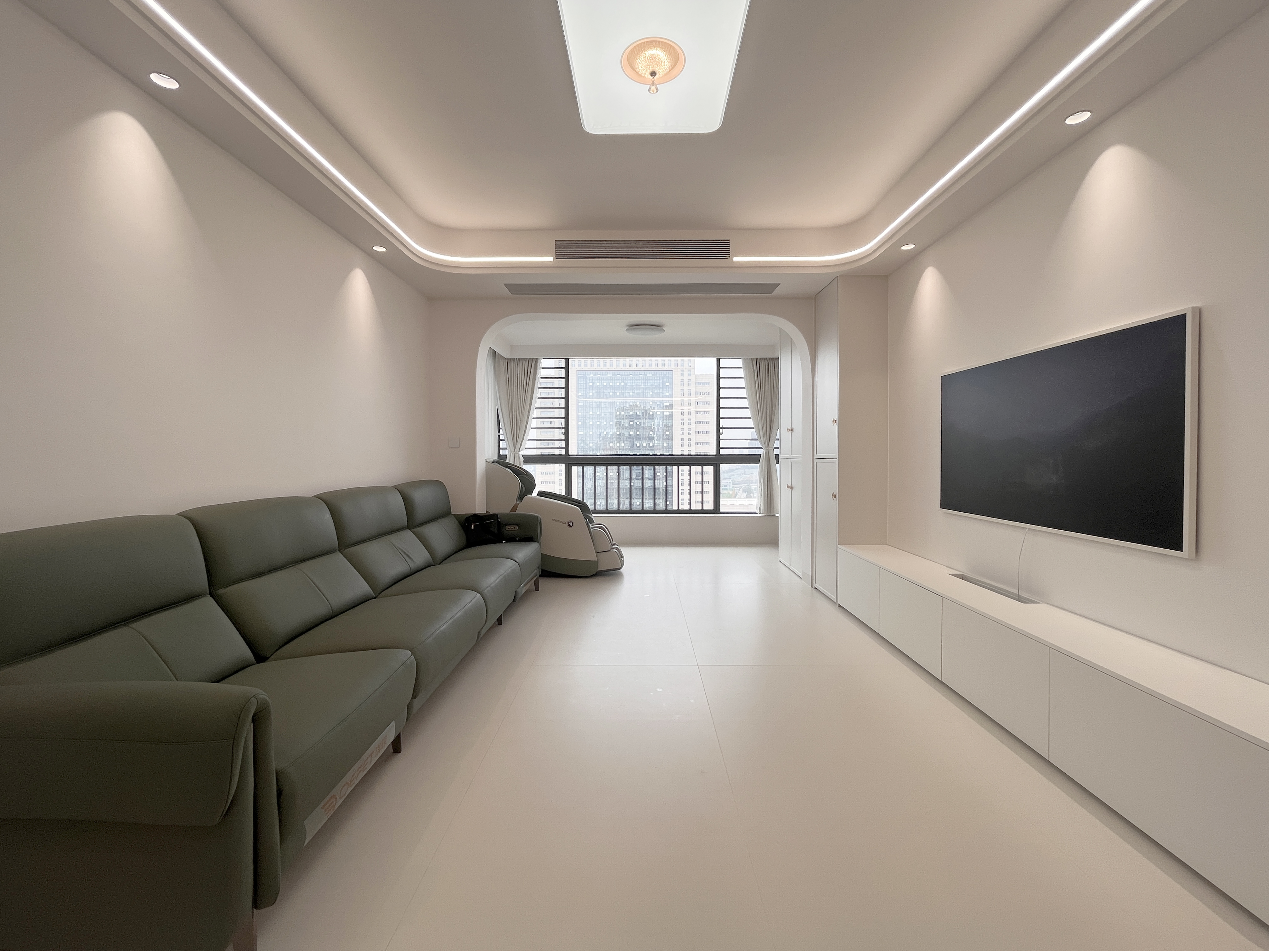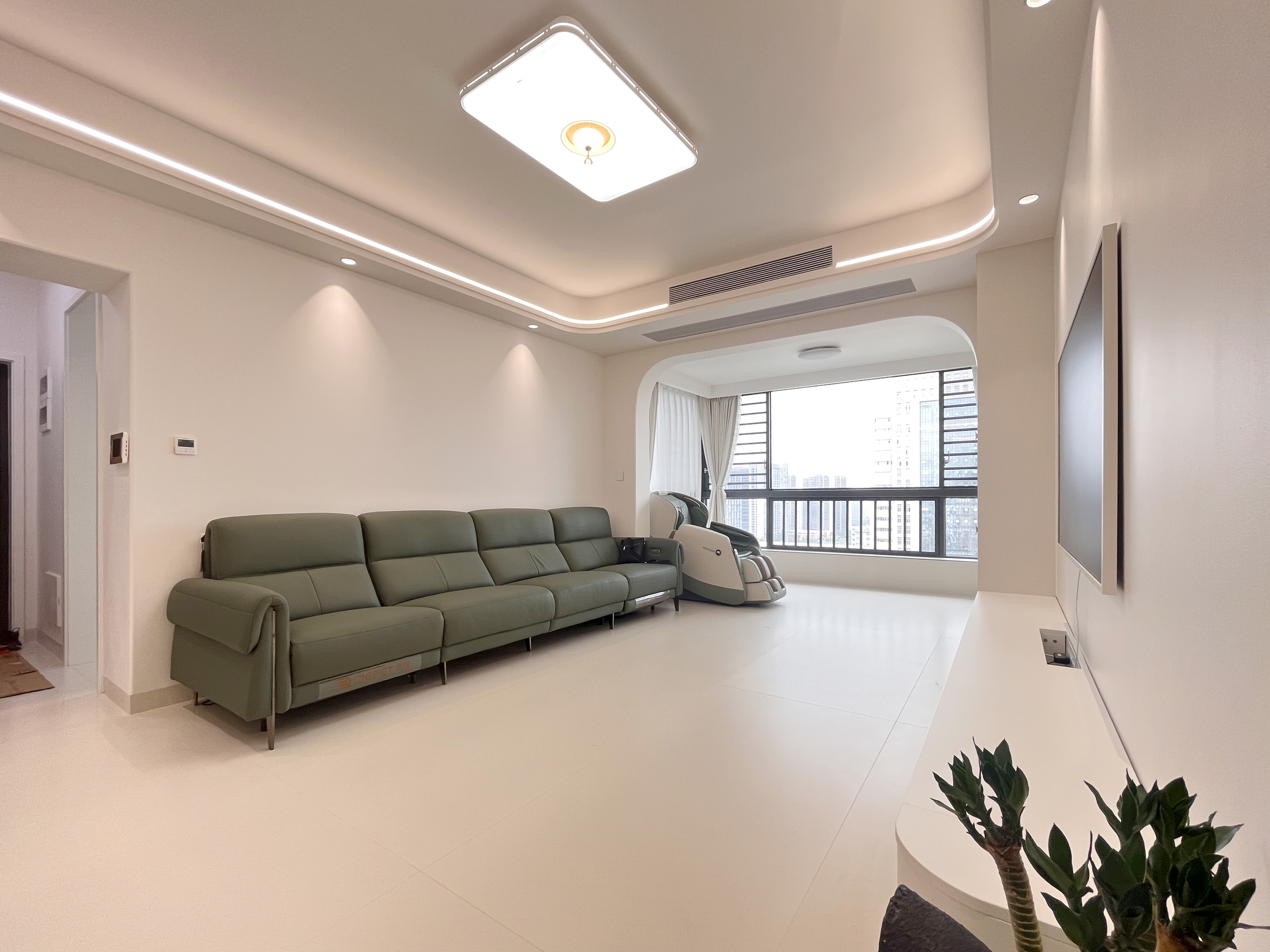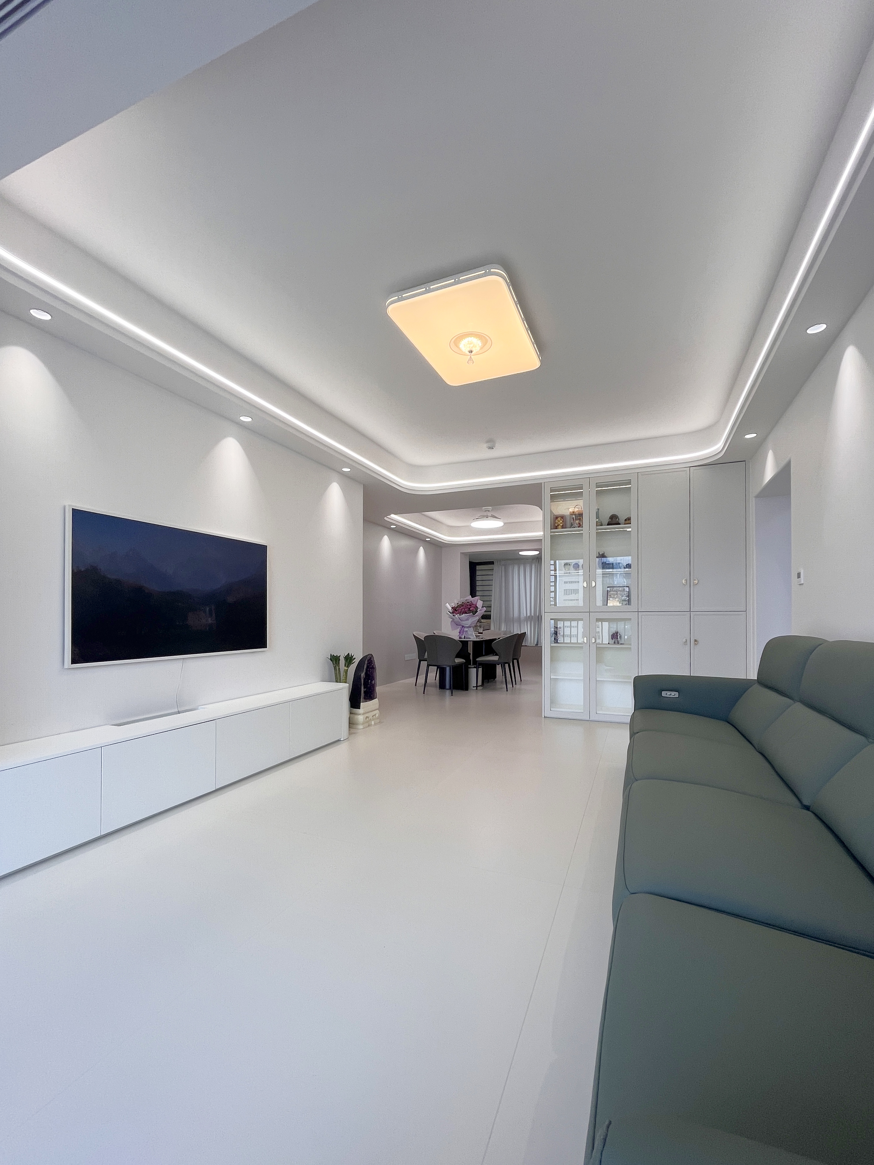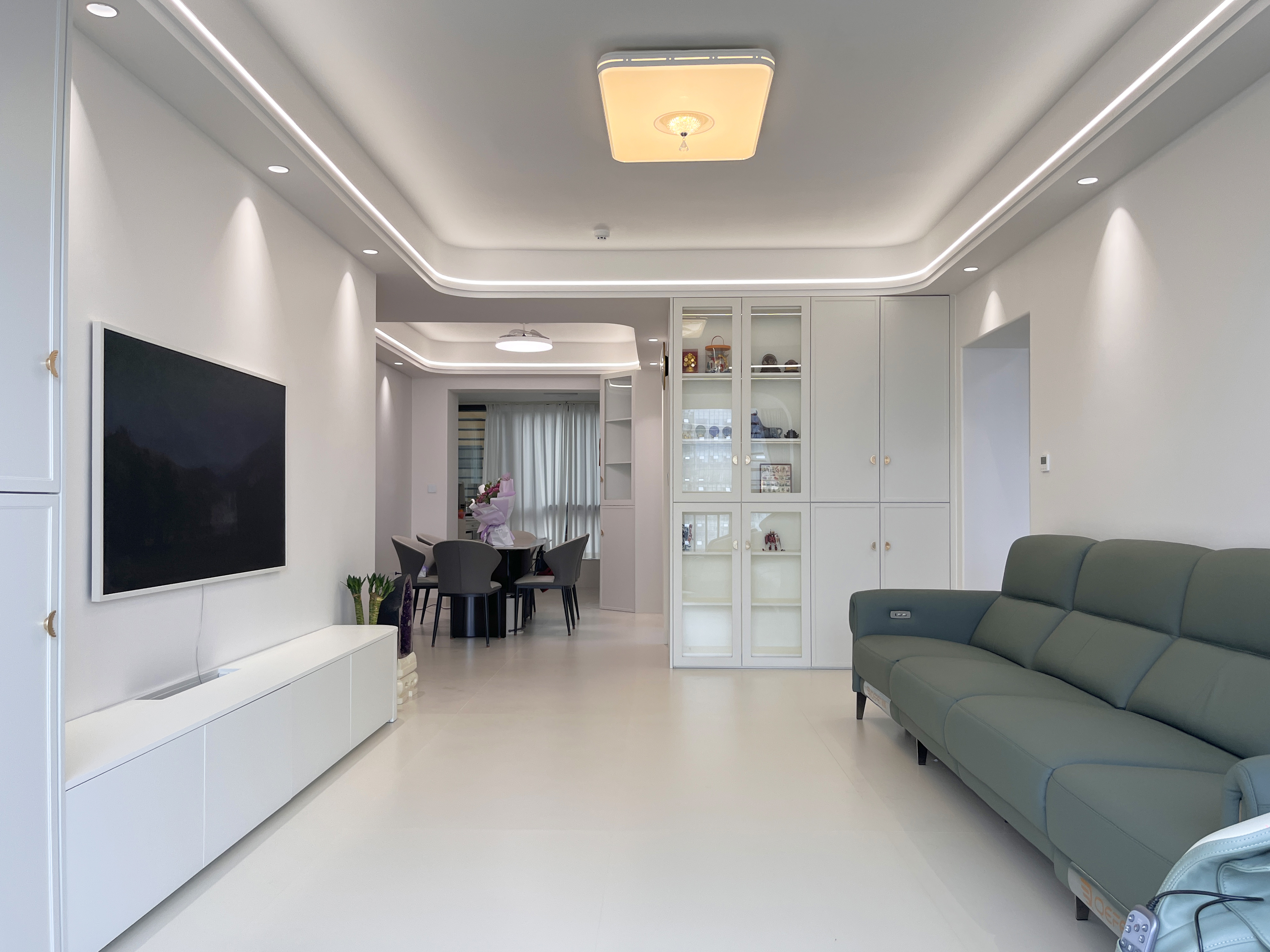 客廳入目就是很純白的色調(diào),有一種高級(jí)的留白感,除去白色,沒有多余的顏色“喧賓奪主”,雙眼皮吊頂在造型上加了燈帶,溫馨的燈效能夠增添視覺上的溫馨以及高級(jí)感,電視背景墻利用簡(jiǎn)單的落地柜實(shí)現(xiàn)了一部分的收納,實(shí)用且美觀??蛷d的軟裝主要以簡(jiǎn)約為主,目前只添置了一個(gè)沙發(fā),綠色的顏色選擇給空間很清新的感覺,有很大的視覺跳躍感。