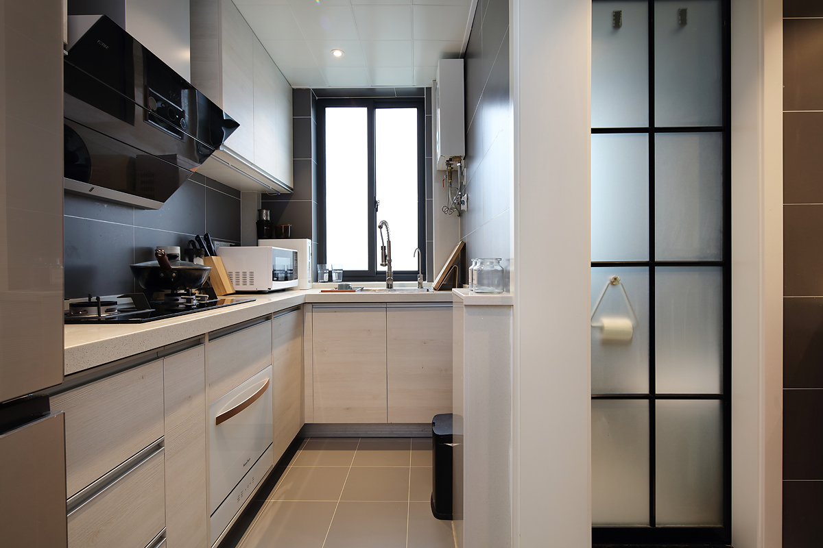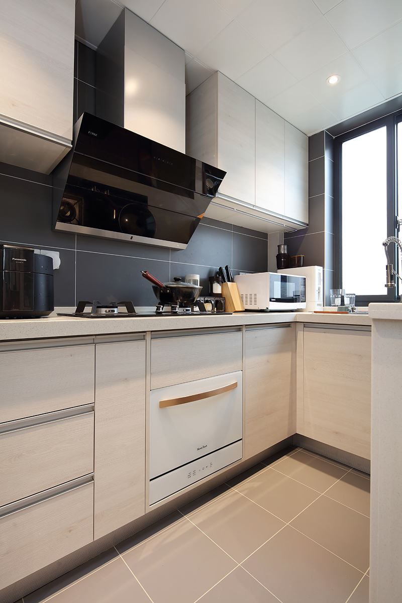 深色的瓷磚和淺色的櫥柜搭配起來很合理,消毒柜被內(nèi)嵌放進(jìn)櫥柜里看,美觀整潔,不占空間。