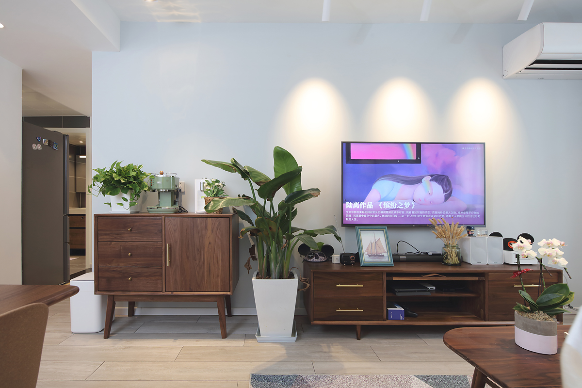電視背景墻使用的是清新的淡藍(lán)色,簡(jiǎn)單自然,在射燈的映襯下溫馨舒適。