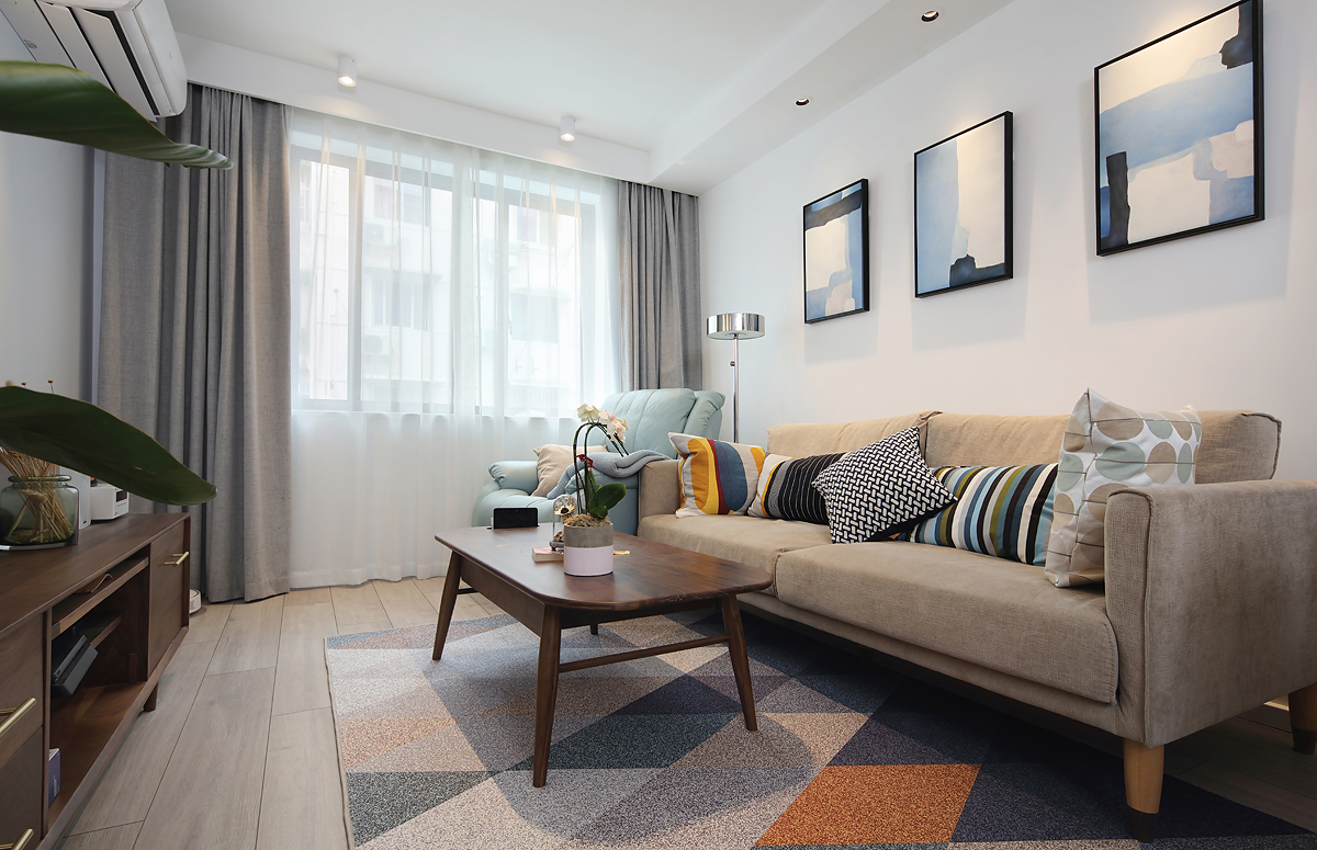 花樣繁多的拼色抱枕和棱格拼色地毯的存在,是為了給客廳增加一點(diǎn)活潑的色彩。這就感覺是,在沙發(fā)這張畫紙上添點(diǎn)色彩,讓客廳的層次感更為豐富。
