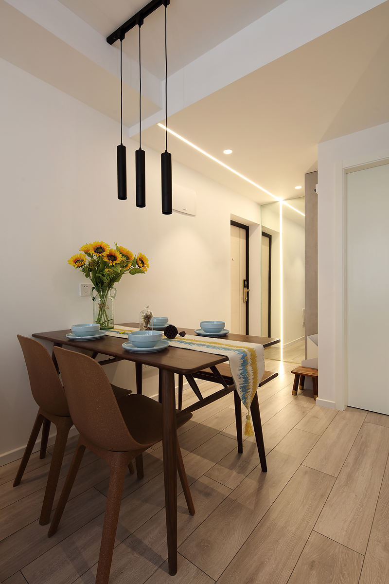 戶型面積小,并沒有單獨(dú)為餐廳留出的空間。設(shè)計(jì)師只是在客廳和玄關(guān)的空余地,擺置了一套桌椅,就完成了餐廳的打造。