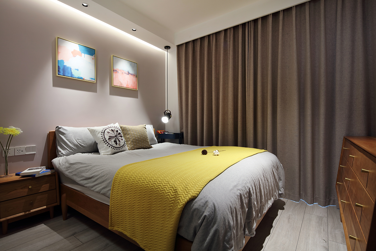 床頭的背景墻跟駝色相近,藏光的設(shè)計(jì)很是獨(dú)特。臥室的光源不需要很多,只要夠用就好。