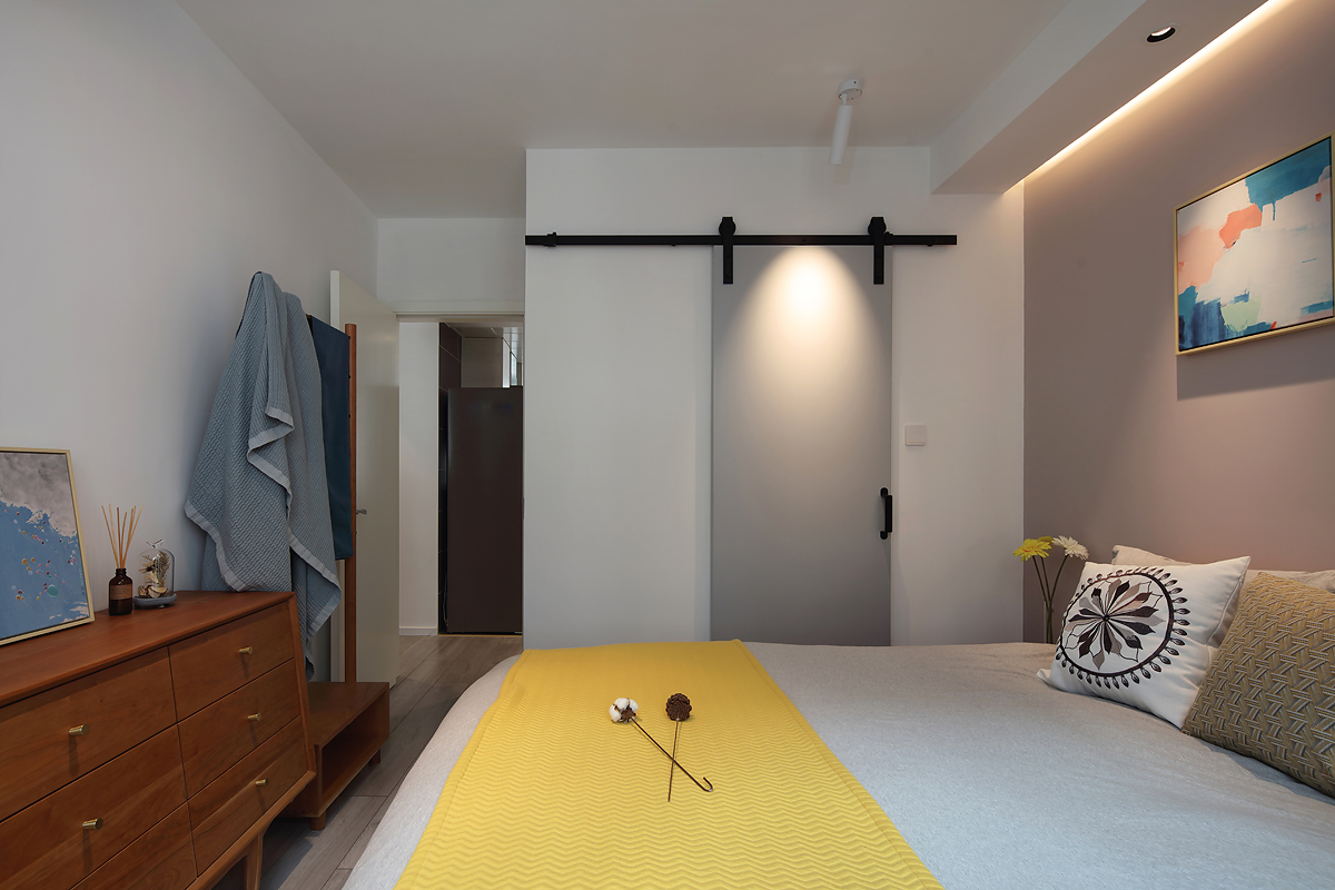 臥室的主色調(diào)是灰與白,床頭柜和儲(chǔ)物柜跟客廳的家具屬于同一系列,滿滿都是復(fù)古風(fēng),彰顯生活品味與家居格調(diào)。