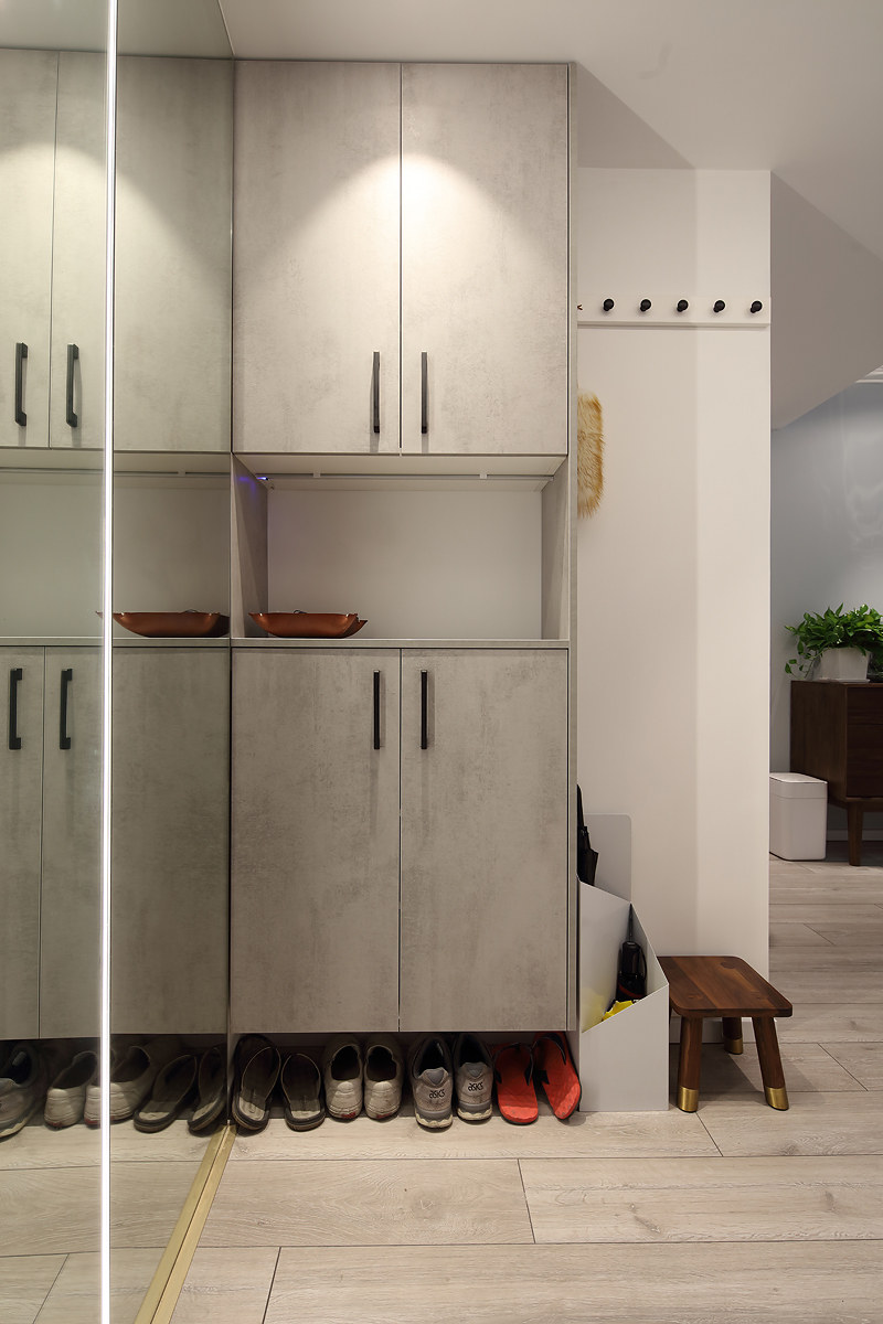 玄關(guān)處的鞋柜是定制的,中間的留空部分是為了隨手放置鑰匙之類的小物件,懸空部分可以放置一些常穿的鞋子,很是方便。