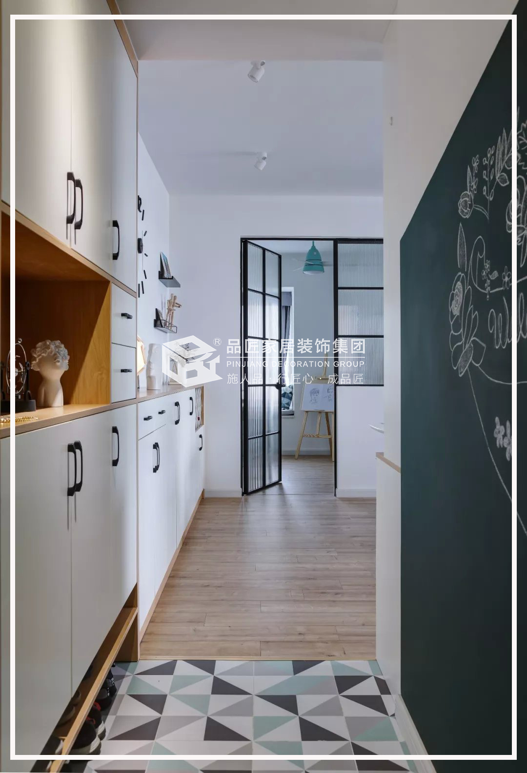 長(zhǎng)長(zhǎng)的鞋柜一直延伸到客廳