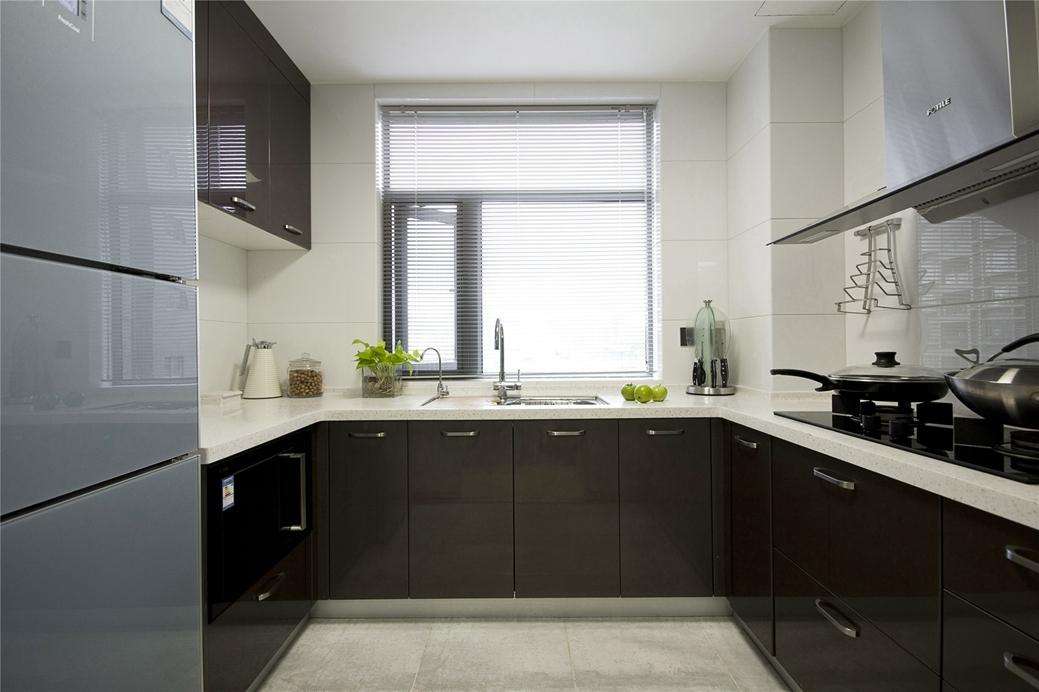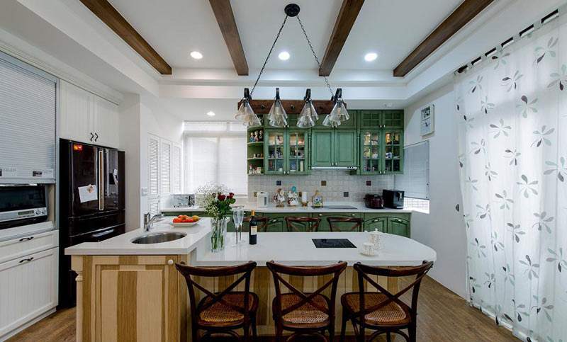 一些不常用的廚具完全可以放到餐廳,這樣也不會占用廚房過多的空間。還可以利用中島臺擴展廚房的操作臺面,中島臺適用于廚房和客廳之間還留有一定空間的戶型。