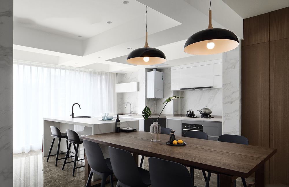 開放式廚房和餐廳之間沒有設(shè)置隔斷,兩個空間的裝修風(fēng)格能夠很好地相融,視覺上也更為明亮寬闊。廚房不會顯得逼仄,餐廳不會顯得狹小,就連客廳的空間都更通透了。