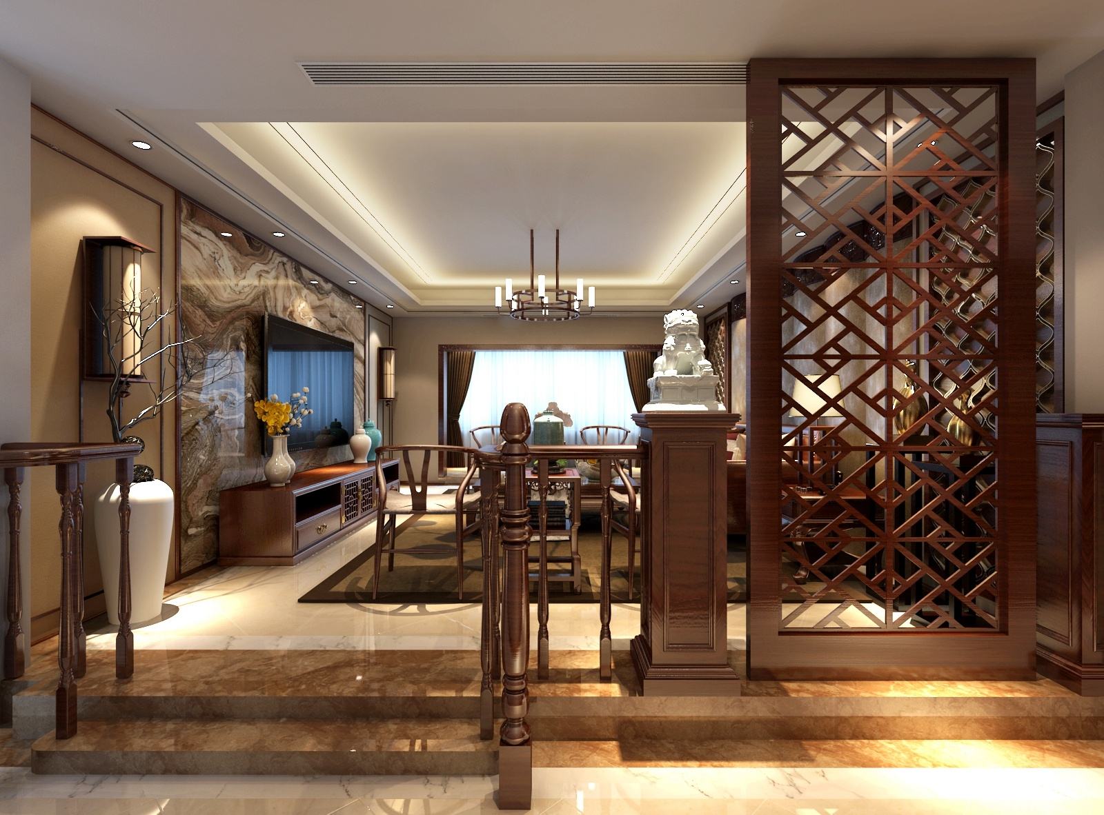 客廳、餐廳和廚房同屬一片空間的戶型并不少見,因?yàn)闆]有條件做隔斷,所以客餐廳通常都是連在一起的。在不影響采光的條件下,客餐廳之間其實(shí)可以使用屏風(fēng)充當(dāng)隔斷,半開放性的設(shè)計(jì)不會(huì)占用太大的空間,樣式也很美觀。