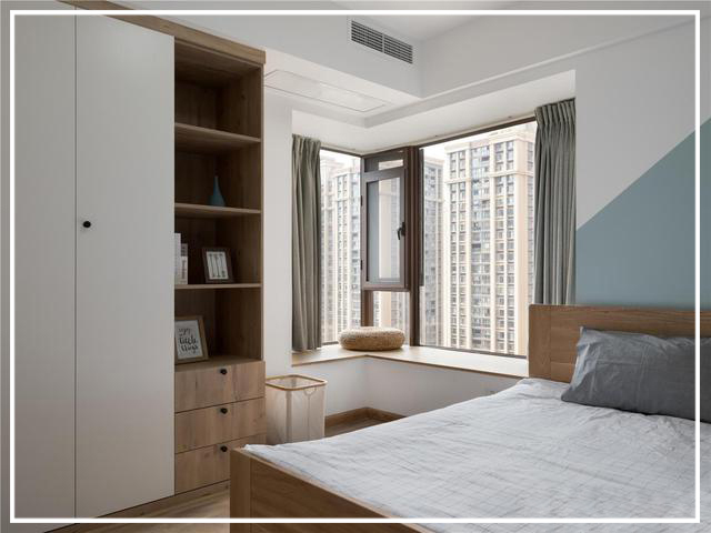 原木色一體床搭配一面莫蘭迪色柔美的背景墻