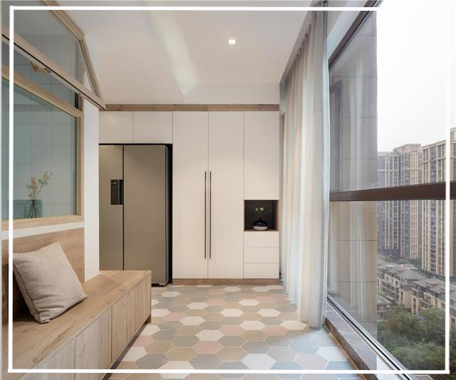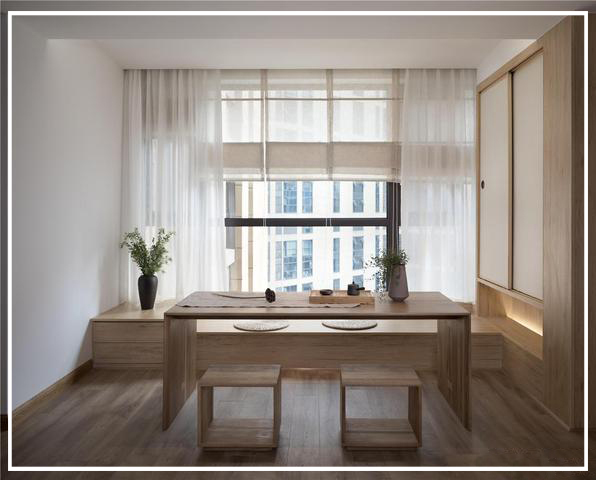 客廳陽臺品茶區(qū)的榻榻米和日式風情推拉柜