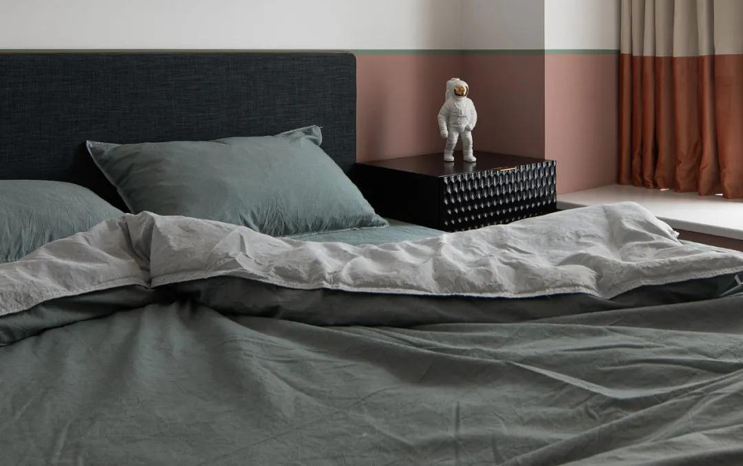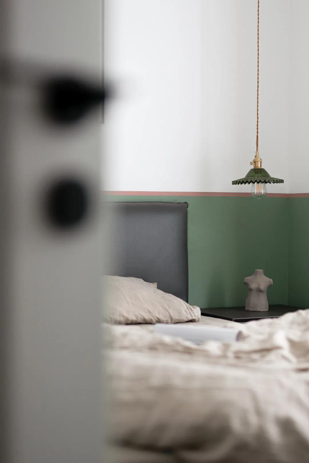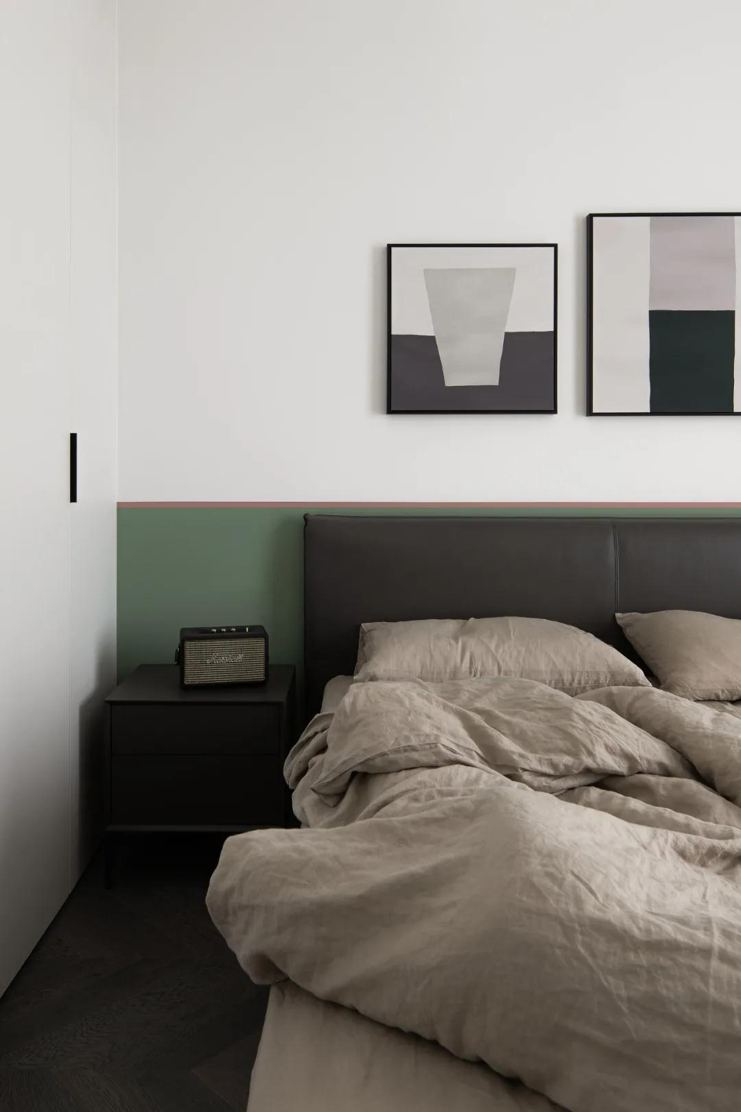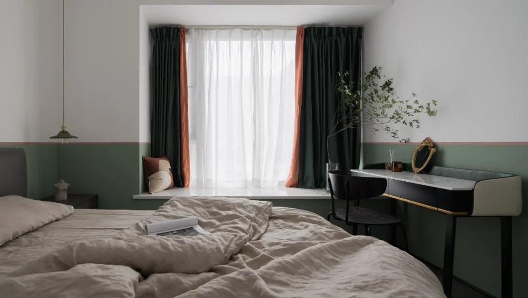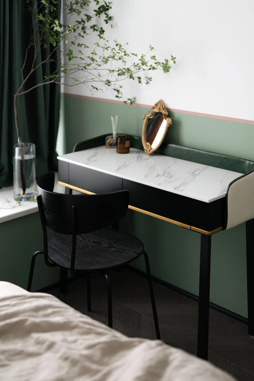 主臥的色調(diào)依舊是綠色,幾何形狀的掛畫,大塊的綠色墻面涂漆,黑色干練的床頭柜,白色的床被枕頭,塊狀的搭配讓房間顯得更簡(jiǎn)潔,點(diǎn)綴小雕塑飾品、復(fù)古音箱和床頭吊燈,床尾窗臺(tái)邊為女主人設(shè)置了梳妝臺(tái),黃銅雕花梳妝鏡搭配簡(jiǎn)約現(xiàn)代的黑白桌椅,古典與現(xiàn)代的碰撞,讓主臥充滿時(shí)尚感和溫馨感。