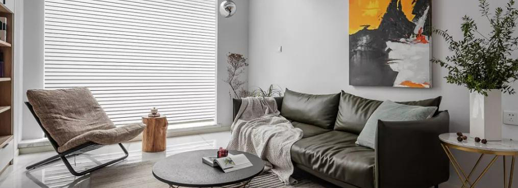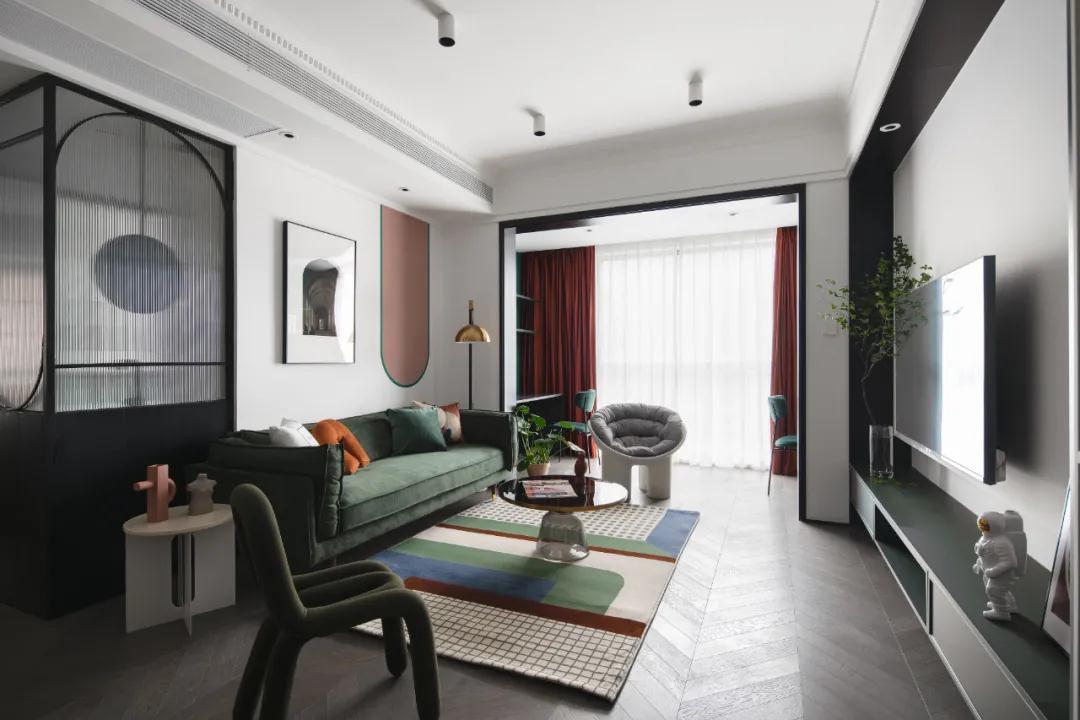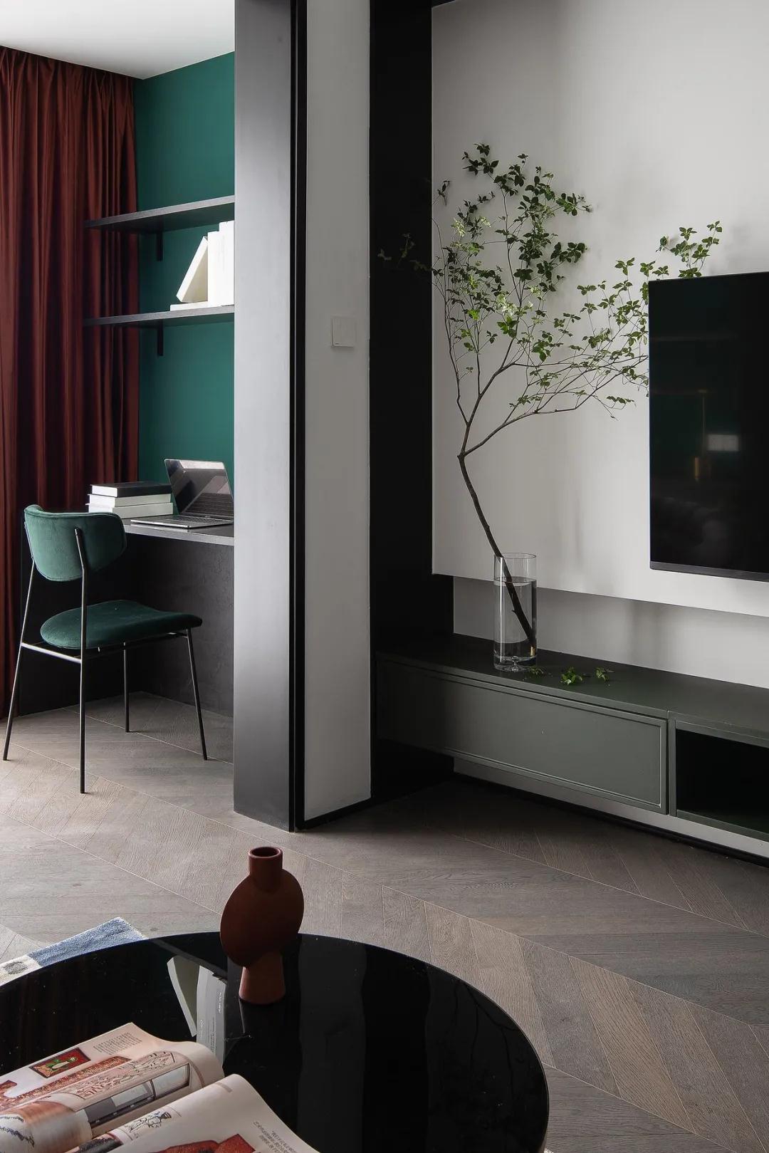 客廳的墻壁以白色為主調(diào),加入低飽和度的墨綠、酒紅、臟粉等色彩,加入微量的黃銅色點(diǎn)綴,使整個(gè)空間看起來繽紛、動(dòng)感。