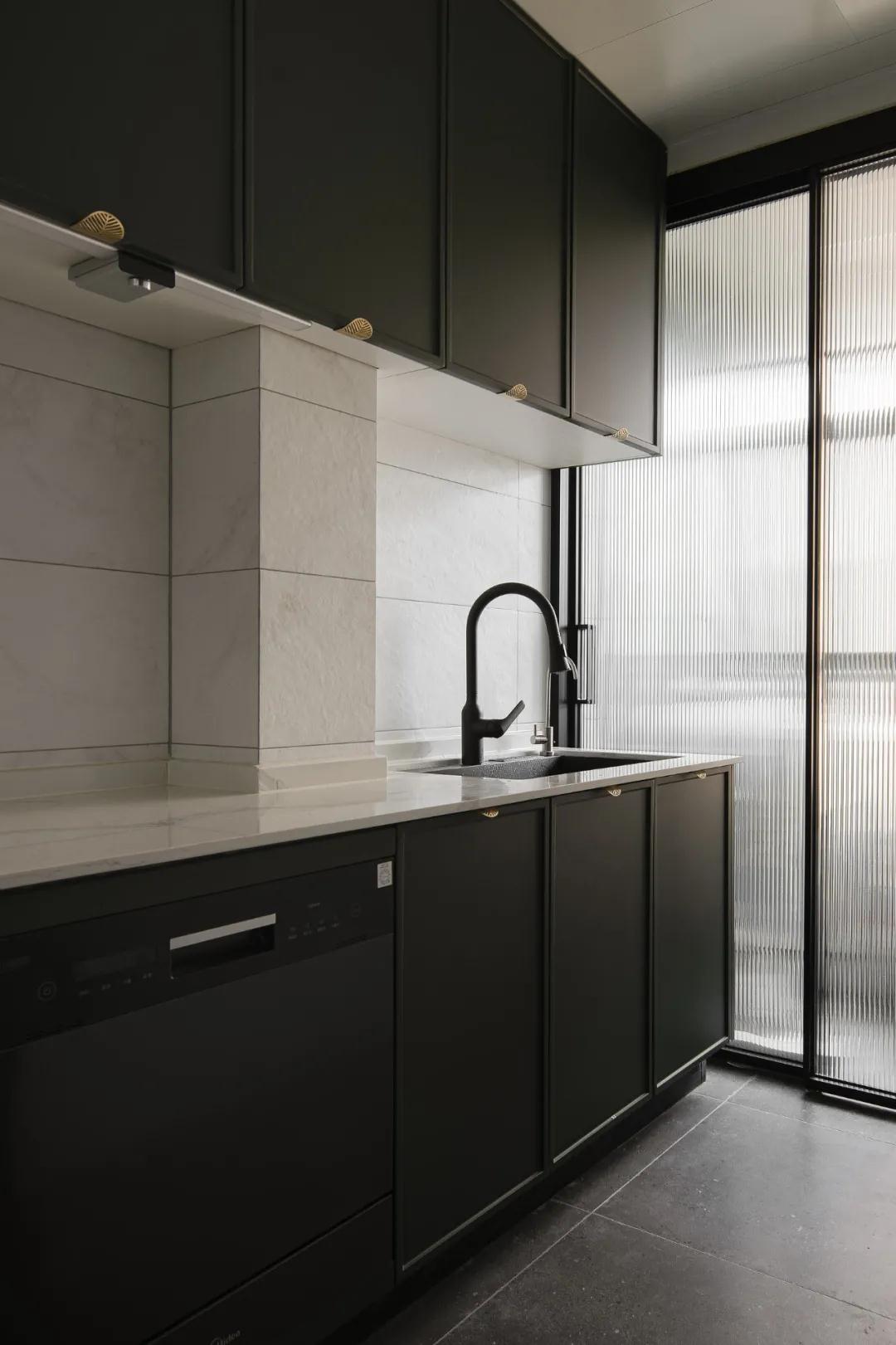 廚房?jī)?nèi)使用大塊的黑白顏色搭配,上下為黑色的櫥柜中間是白色的料理臺(tái),大量的收納櫥柜告別瓶瓶罐罐的雜亂,讓廚房看起來整齊干凈,嵌入式洗碗機(jī),讓小巧的廚房充滿高級(jí)感。