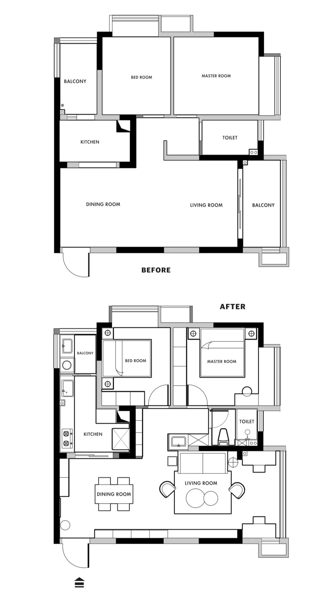 由于業(yè)主夫妻的工作性質(zhì),有大量的時(shí)間需要在家辦公,所以我們把開放式陽(yáng)臺(tái)納入客廳,并將其改造成適用于辦公的地方,一人一端的桌椅,讓兩人擁有充足的辦公空間。