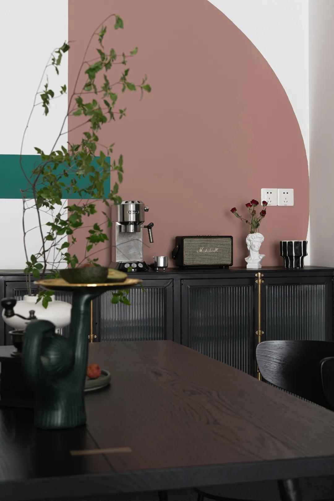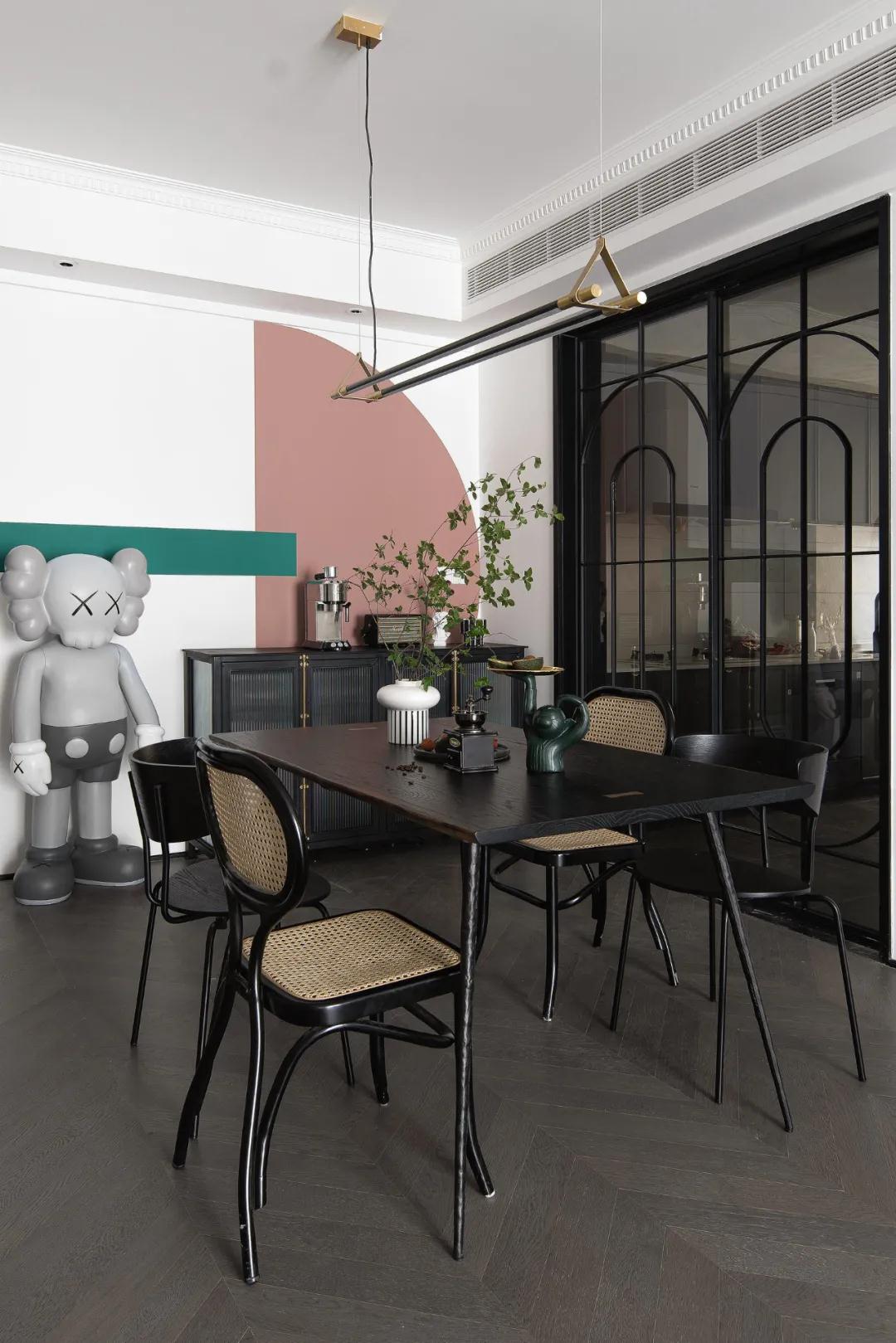 餐廳與客廳相連,以白色為主色調(diào),點(diǎn)綴活潑明亮的粉色和綠色,與黑色沉穩(wěn)的餐柜座椅形成色彩反差,為沉穩(wěn)的空間注入更多的輕盈明亮。餐邊柜上的咖啡機(jī)、復(fù)古音箱、雕塑花盆,桌子上的猴子托盤,讓這個(gè)家充滿故事感。
