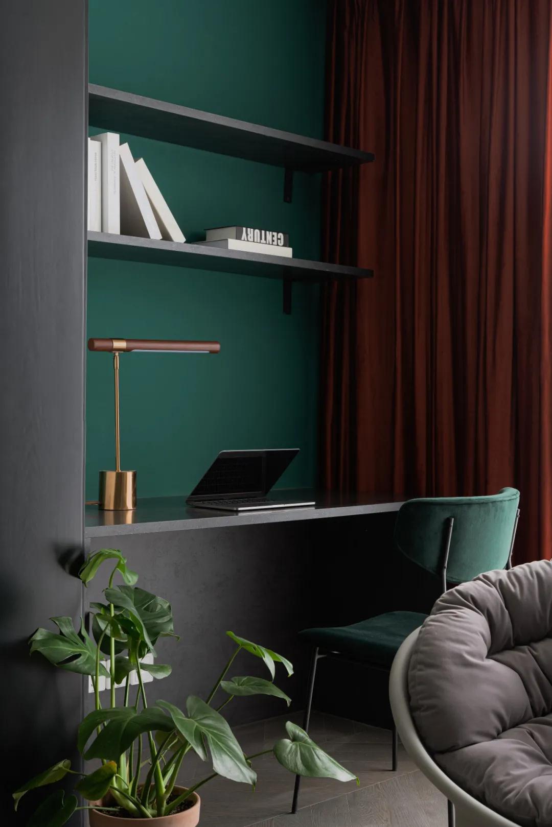 特意選用酒紅色的絲絨窗簾與地毯色塊相輝映的同時(shí),又與墨綠色的沙發(fā)以及辦公區(qū)的桌椅墻面形成反差,達(dá)到色彩的平衡。