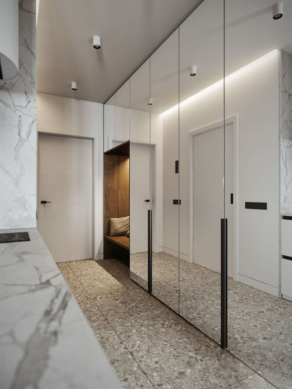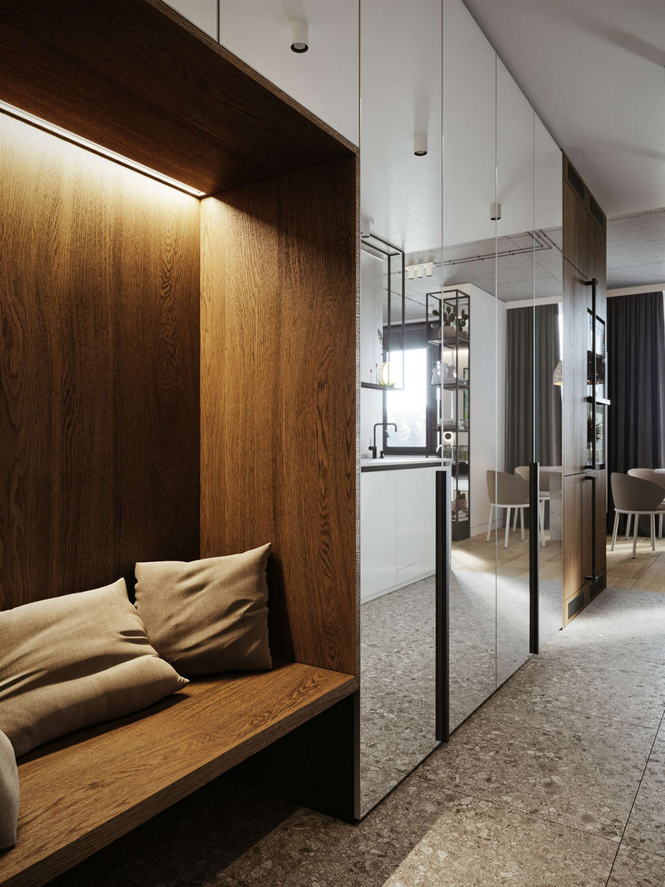 入門,超大面積的的玄關柜,需要完成鞋品衣物的收納,鏡面的柜門將玄關的空間視覺感擴大一倍,讓整個空間看起來寬敞明亮,簡單的木質換鞋凳,放上兩三個柔軟抱枕,下面是超大的換鞋格,足以放下女主人的所有鞋子,回家脫掉鞋子,可以在這里攤上小半刻,卸下在外奔波帶回來的一身的疲憊。