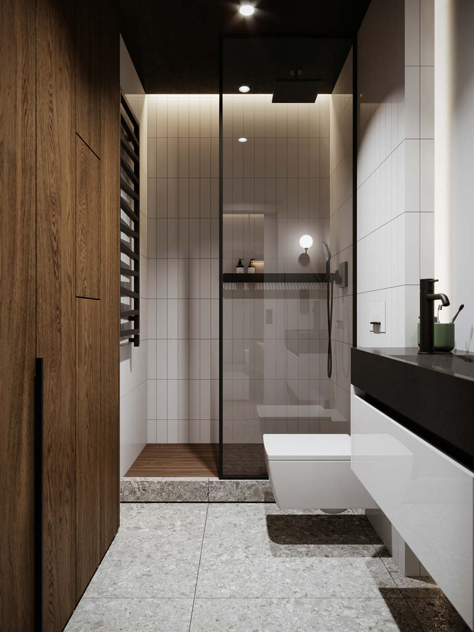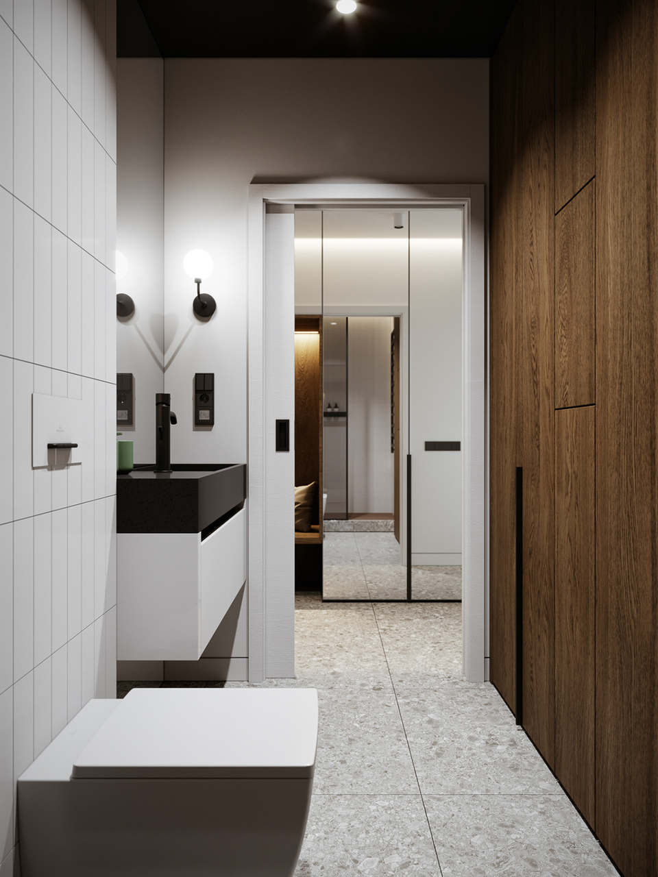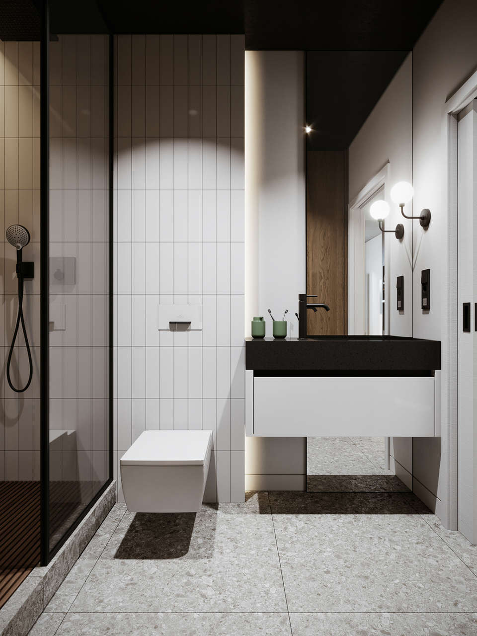 衛(wèi)浴位于入門的右手邊,由于空間限制我們采用吊軌式推拉門,衛(wèi)浴空間以白色為主色調,搭配黑色的五金器具,進門右手是方形簡約的黑白洗漱臺,左手邊我們安置了一個超大的防潮浴室柜,將洗衣機、烘干機安置于其中。
