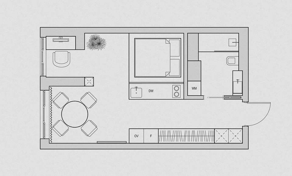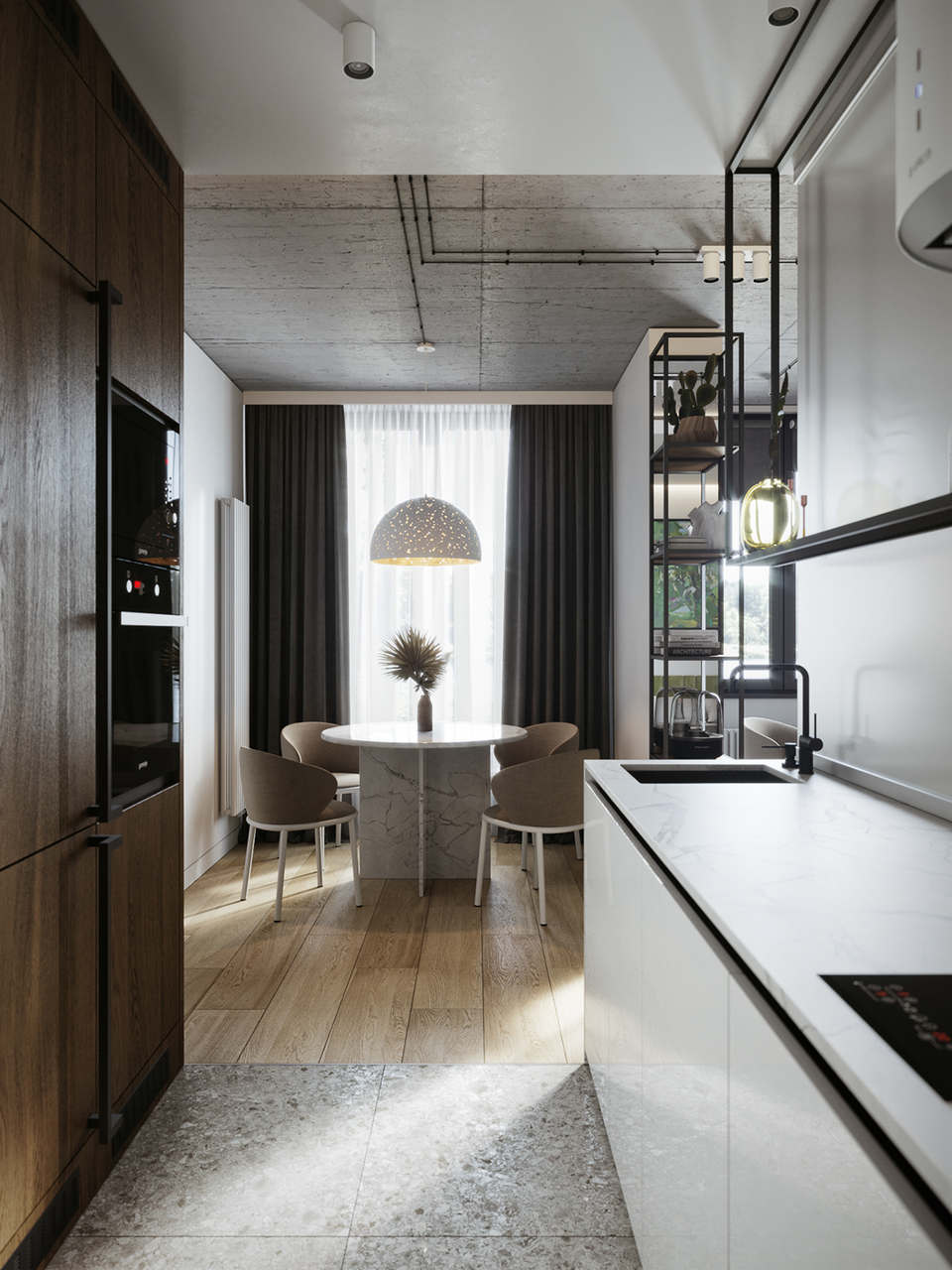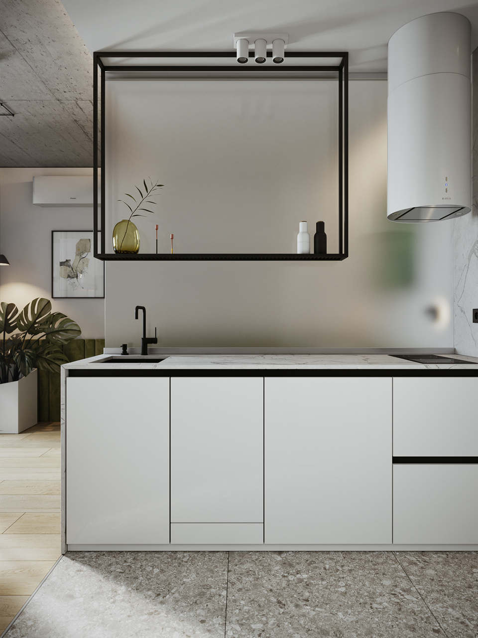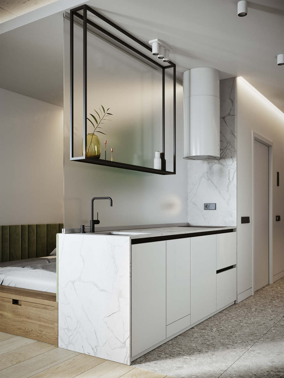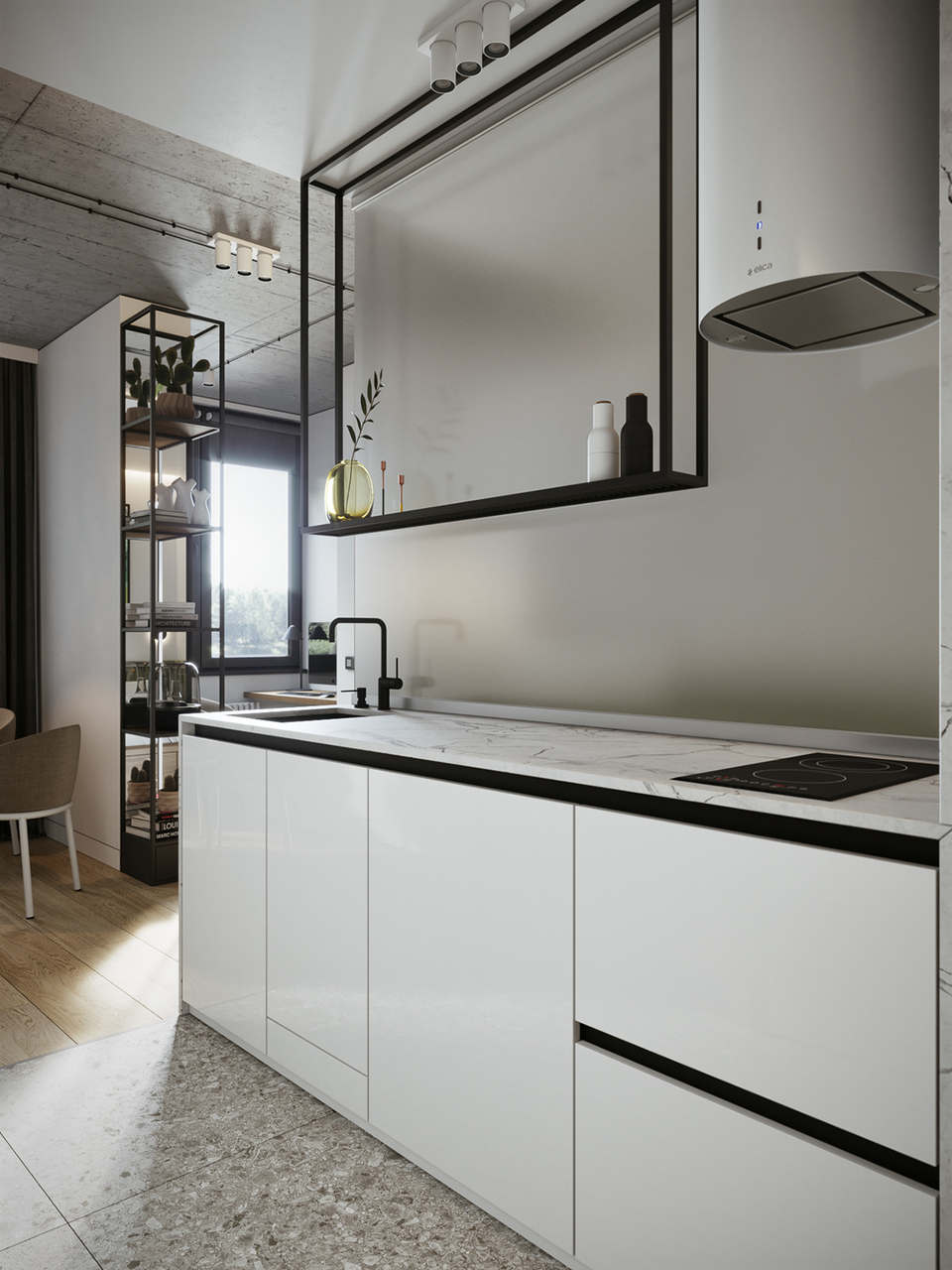 不需要很大的廚房空間,一個簡單精巧的料理臺就能滿足一日三餐的制作需求,白色的地柜搭配懸掛式置物鐵架,一實一空一大一小,有趣非常。與玄關柜并列,木質紋理櫥柜調和玄關至廚房的色彩,將烤箱和微波爐嵌入櫥柜中,似將其收納入其中而又不影響使用。