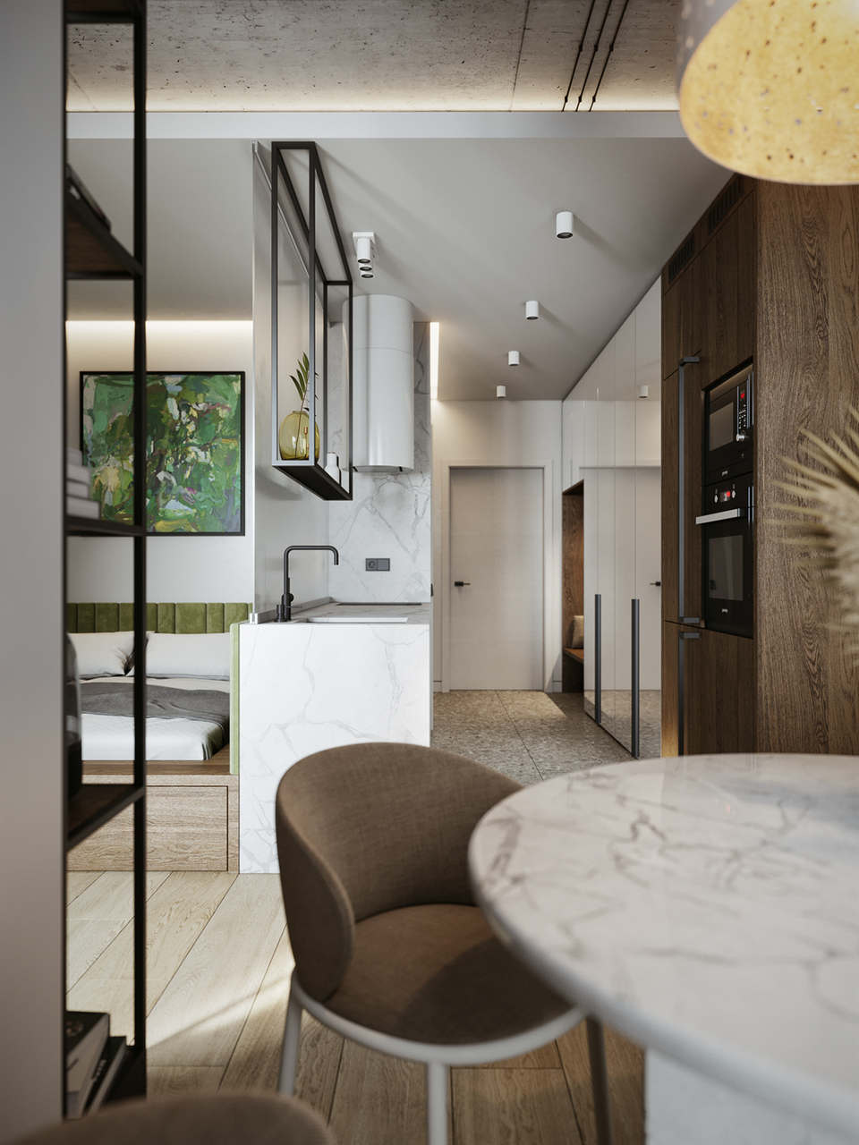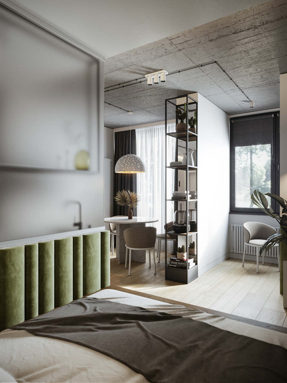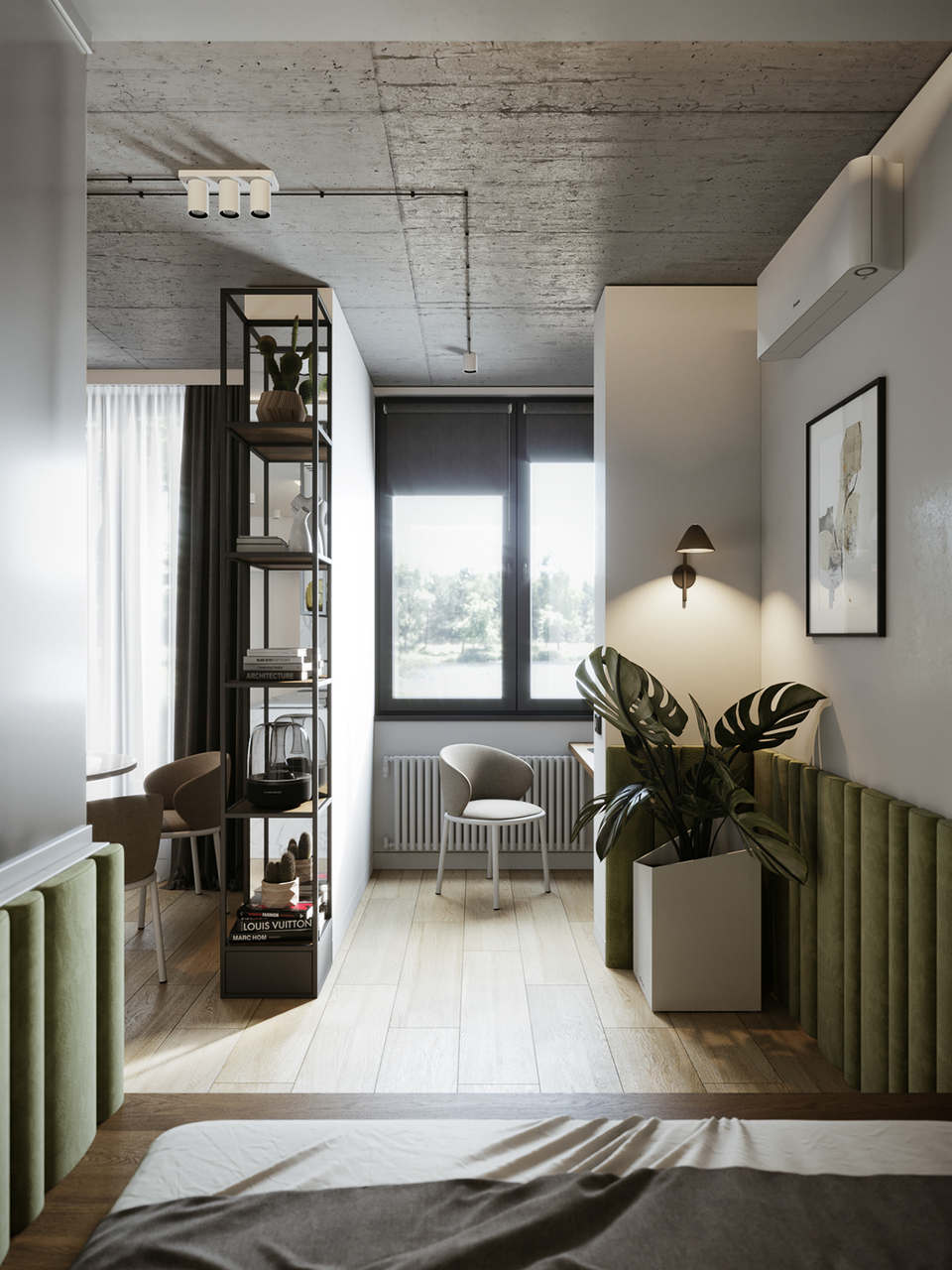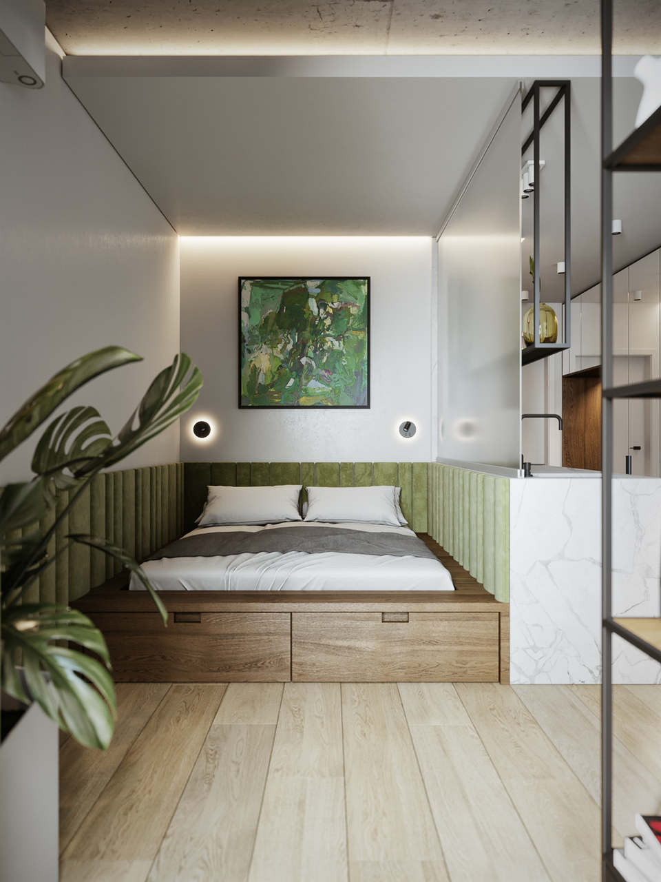 在這個房子里沒有明確的空間劃分,床與廚房用毛玻璃相隔,簡單的榻榻米式臥床,床頭掛上綠色油畫與床尾的綠色植物相對應,周圍采用半米高形似樹樁的綠色絨面防撞軟包設計,防止磕碰的同時填充墻體的空白,讓人置身森林小屋,給人自然舒適的感覺。