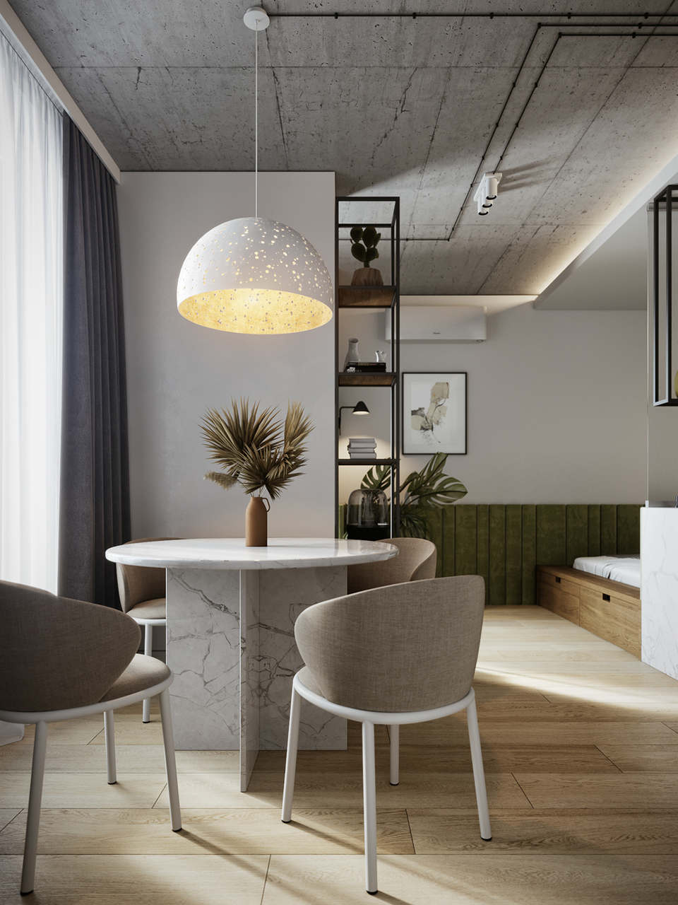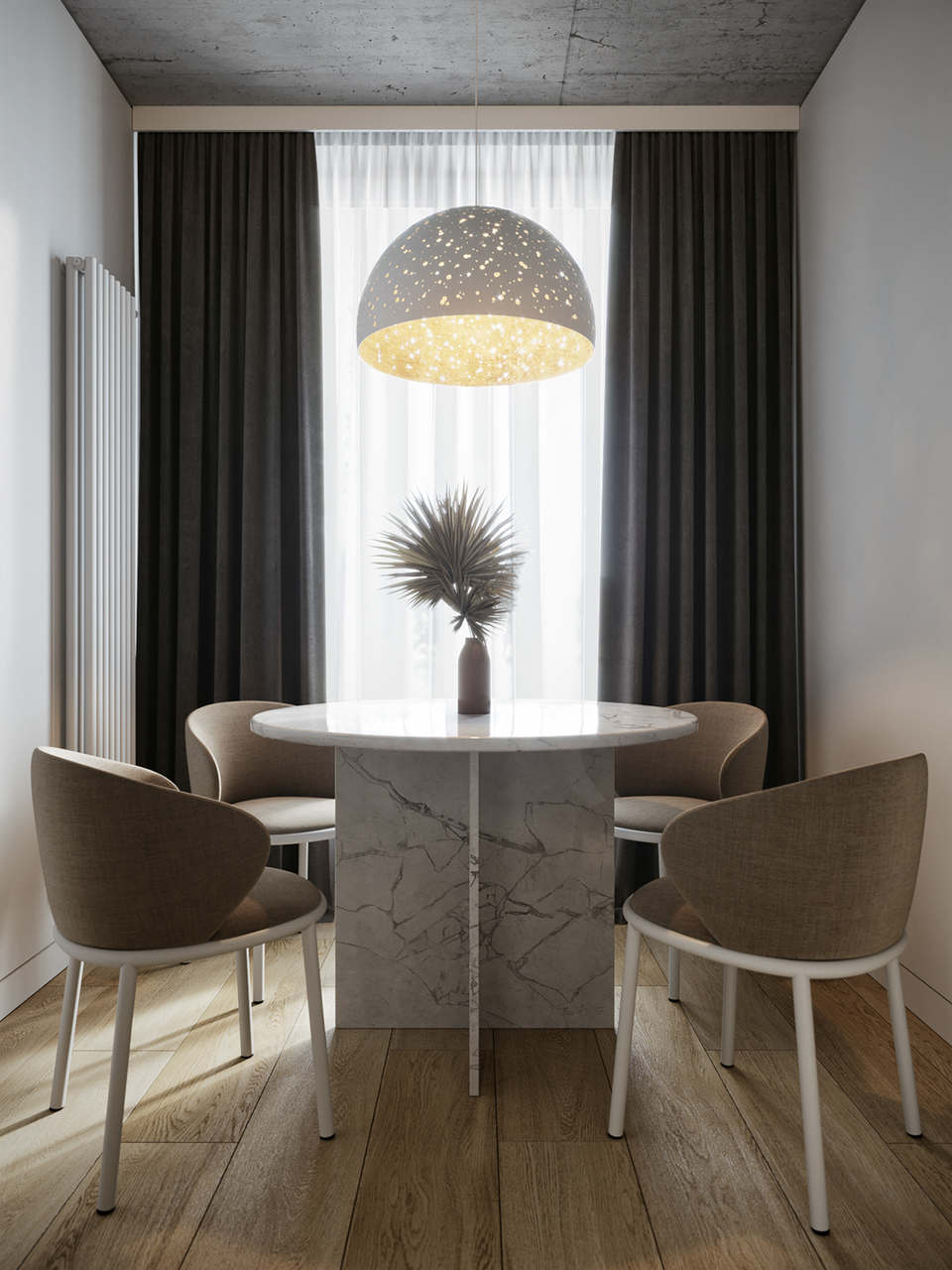 在這里我們選擇去掉客廳這一空間設計,直接安置上圓形的餐桌,舒適的餐椅。就餐時擺上碗筷便是一個舒適溫馨的是餐廳,收起碗筷又好似只是一個休閑區(qū),沒有特定的功能劃分。