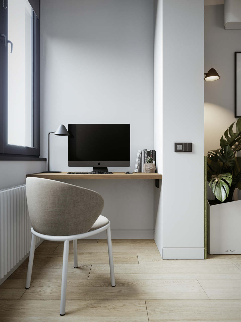 25㎡的小空間卻有兩堵不可拆除的承重墻,女主人本來想在這里安上一扇門打造成晾衣陽臺,但是這個想法馬上被設計師否定了,如果在這里裝上門,掛上衣物,不但縮小了空間面積,臥室的采光將受到很大的影響。我們在這里裝上掛墻式書桌,放上電腦就成為一個辦公的小書房,合理的利用空間且不會影響采光。