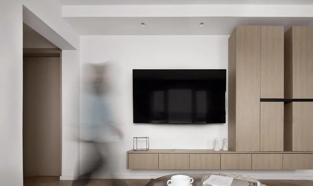 電視柜與餐廳吊頂、卡座采用同一款成品木飾板鋪貼而成,是整體空間達(dá)到色系統(tǒng)一與和諧。