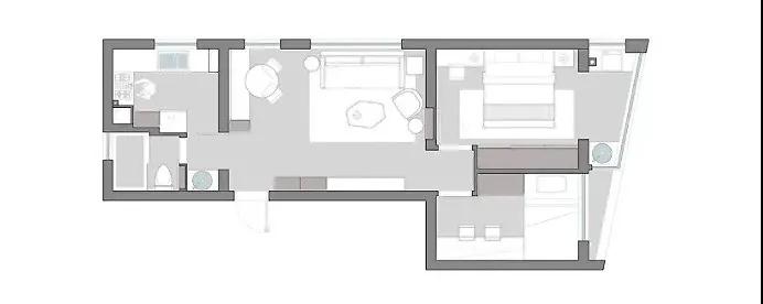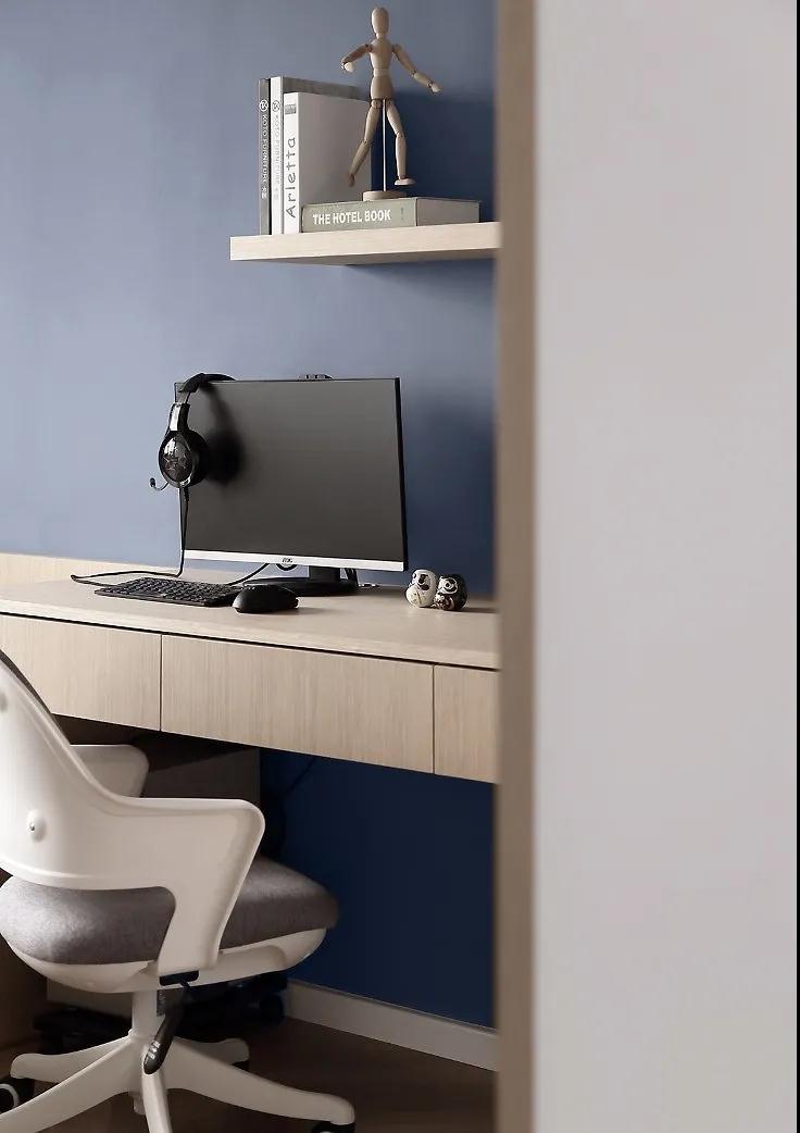 藍(lán)灰色墻面與客廳沙發(fā)背景墻色系相同,與原木色相襯干凈利落,作為書房和客臥,放上一張單人床,放置一個(gè)懸掛式書桌,整個(gè)空間寬敞明亮。