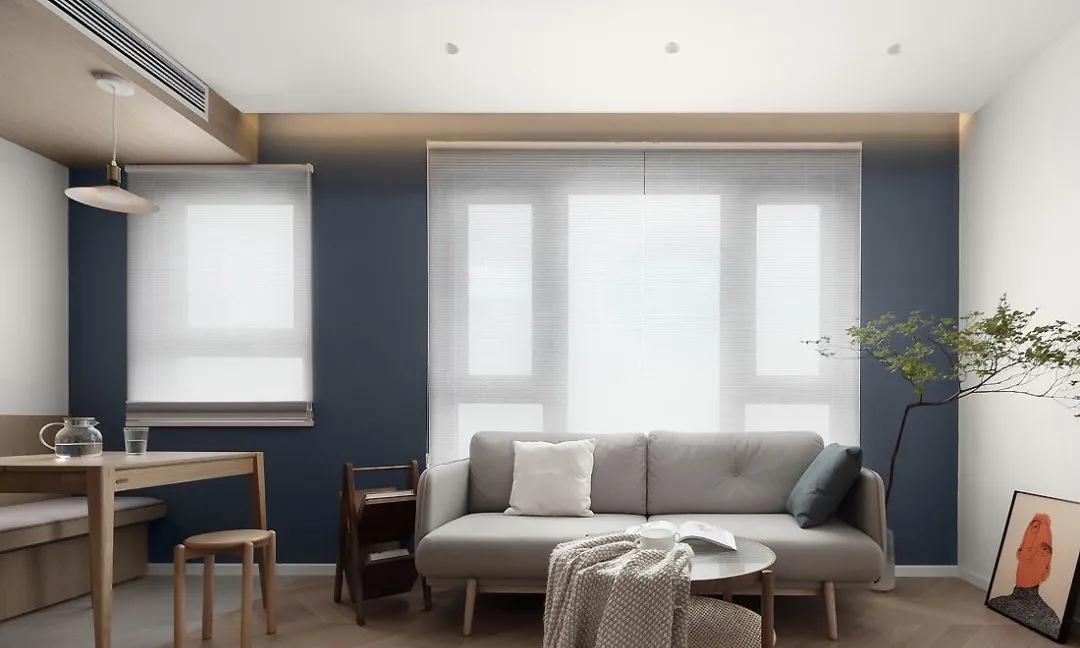 L型掛墻電視柜與白色乳膠漆墻面搭配簡(jiǎn)單而不失格調(diào),藍(lán)灰色沙發(fā)背景墻是空間色彩的點(diǎn)綴,搭配素凈的白色百葉窗簾,不需要過多的前面裝飾,便能給人輕盈而靈動(dòng)的質(zhì)感。