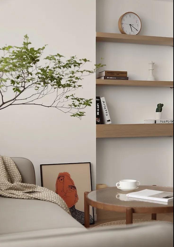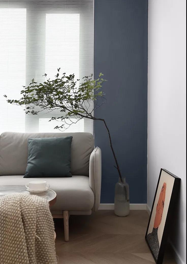 客廳的一角擺放上一枝綠植給自然的空間添加了一份綠色清新感,旁邊放上一幅橘色調(diào)的畫,以暖色增添空間的溫馨感。