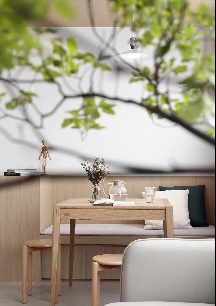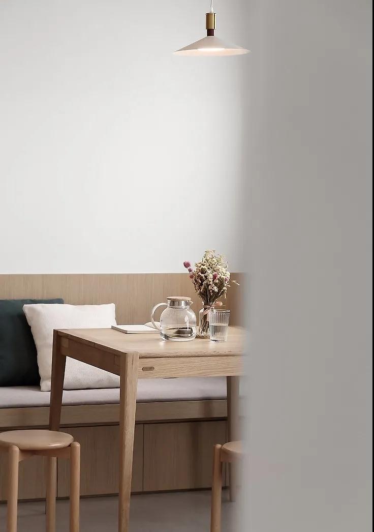 餐廳卡座做成開門式收納柜,鋪上軟墊與抱枕,提高坐感的舒適度,搭配簡(jiǎn)單的原木色系木質(zhì)餐桌,打造溫馨質(zhì)樸的就餐環(huán)境。