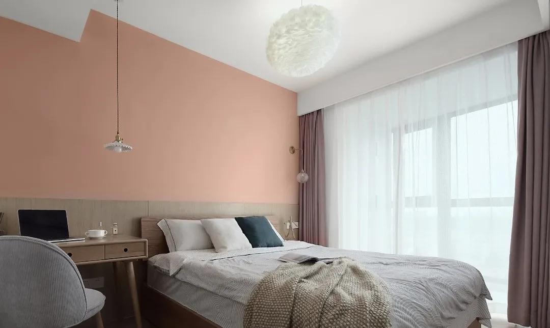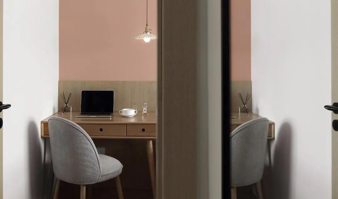 粉橘色的墻面配以金屬壁燈,高腳書桌搭配復(fù)古吊燈讓整個(gè)空間變得輕盈且溫柔,臟粉色窗簾與原木色相撞,多了幾分溫馨又讓人心動(dòng)的復(fù)古感。