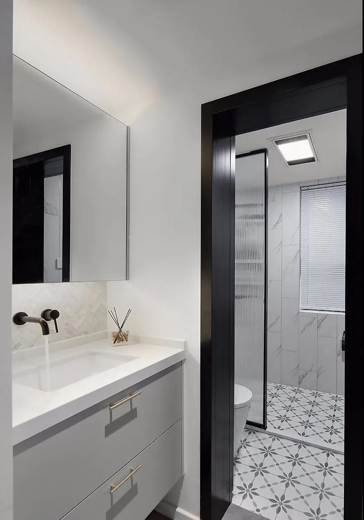 衛(wèi)生間做了干濕分離,淋浴區(qū)用擋水條與一塊長(zhǎng)虹玻璃作為隔斷,整個(gè)空間白色為主配以黑色的線條框線,不會(huì)過時(shí)的搭配,簡(jiǎn)單而充滿高級(jí)感。