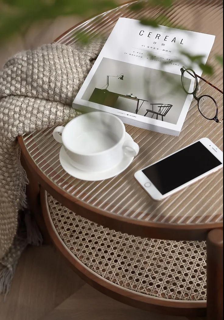簡(jiǎn)約的雙層圓形茶幾,上層以帶有紋理的半透明玻璃作為臺(tái)面,下層以藤編作為置物層,給人復(fù)古自然的的視覺感。