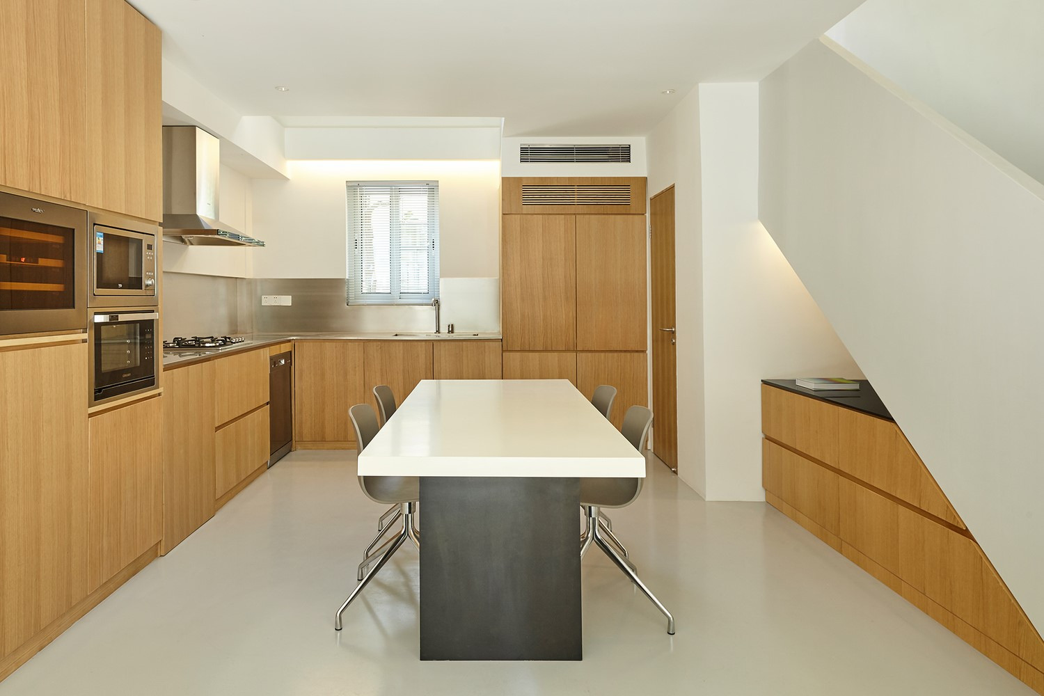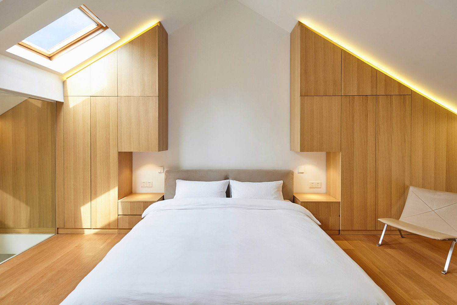這一套簡單的小復(fù)式,用了簡單的方式去裝修。不管是上層的主臥還是下層的空間,都是白墻配上原木,這讓整個(gè)空間看起來十分開闊明亮。