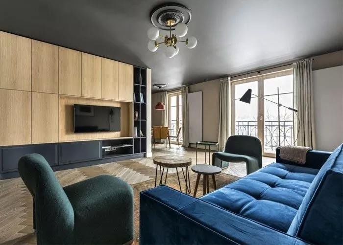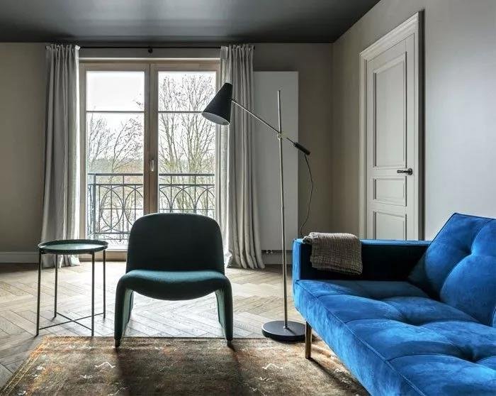 寶藍(lán)色的沙發(fā)有一種高貴的古典感,作為客廳里最亮眼的存在,它以一己之力提升了整個空間的色彩亮度。