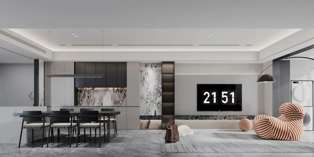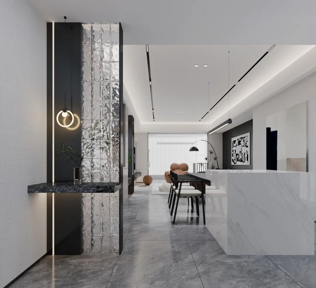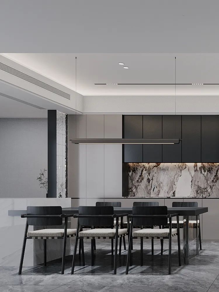 開放式餐廳,由白色吧臺黑色餐桌構成,用餐之余,可與朋友在吧臺上飲茶做樂,餐廳旁柜子臺面為大理石紋理增添了一抹奢華感,整體空間雖不繁復,但每個細節(jié)都經(jīng)過精心布置,展現(xiàn)出高品質的設計感。