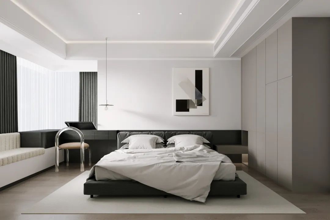 臥室以白色和灰色為主調,營造簡潔寧靜氛圍,大床居中,兩側分別配置沙發(fā)和椅子,形成休息與休閑區(qū)域,現(xiàn)代吊燈增添溫馨感,大面積地毯提升舒適度,閱讀角設于窗邊,充分利用自然光。