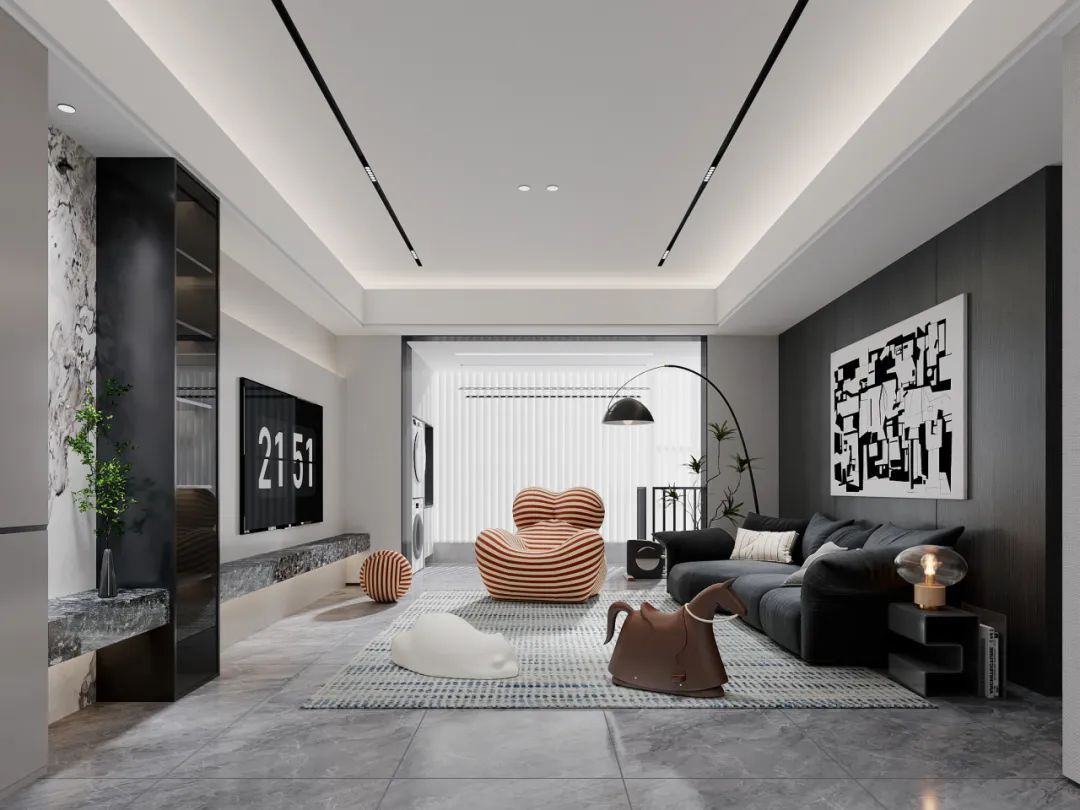 灰色大理石地板與深灰色墻面,構成了沉穩(wěn)的基調,家具以黑色為主,搭配橙色條紋抱枕,既保持了整體的簡潔性,又增添了活力與亮點,空間布局合理,家具擺放緊湊而不擁擠,營造出寬敞舒適的氛圍。