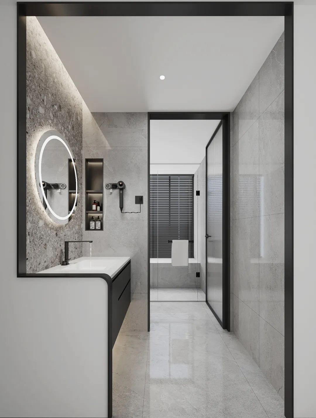 干濕分離,功能區(qū)域分明,灰白為主,大理石紋理設計增添高端質感,左側梳妝臺配備圓形鏡子和白色洗漱盆,下方為黑色抽屜柜,實用且美觀。