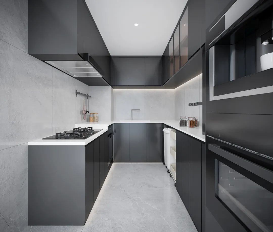 U型布局廚房,功能劃分合理,電器設備如烤箱、爐灶、微波爐等嵌入式設計,可節(jié)省空間同時提高使用效率。