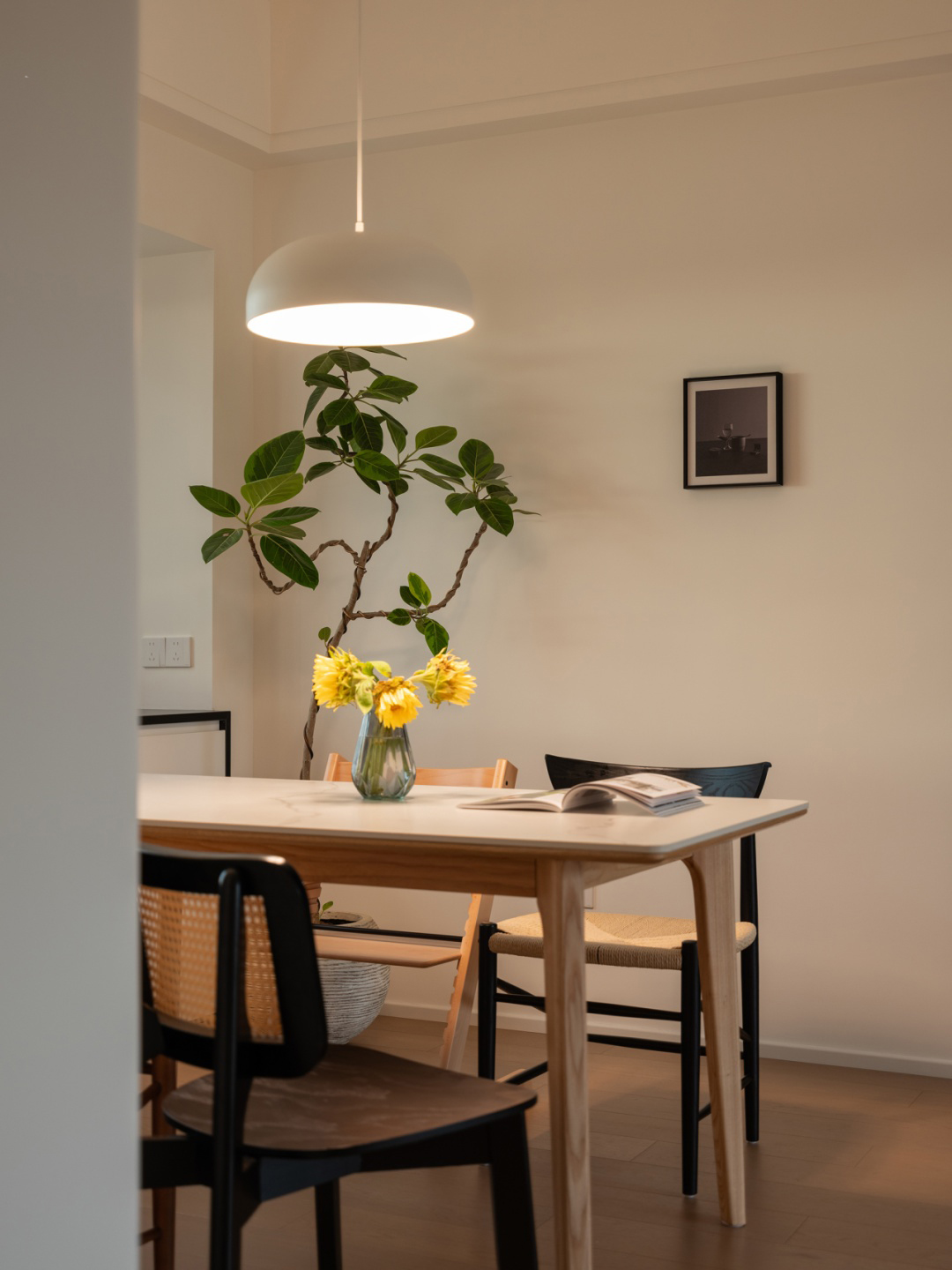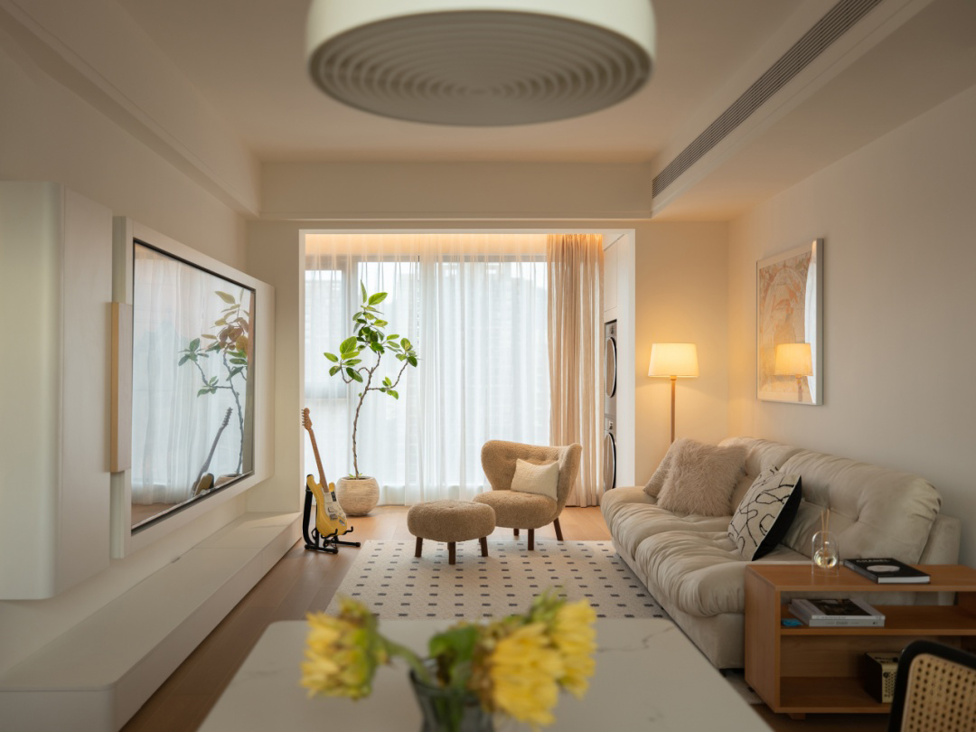 軟裝色彩豐富而和諧,米白色沙發(fā)作為基調(diào),搭配黃色與灰色的抱枕,以及一束鮮艷的黃色花束、落地?zé)舻呐S色的光線,與周圍的色彩相互呼應(yīng),為空間增添了明亮與活力。大窗戶引入自然光,窗簾采用淡雅的米色,與整體色調(diào)融為一體,讓整個(gè)空間更加明亮寬敞。