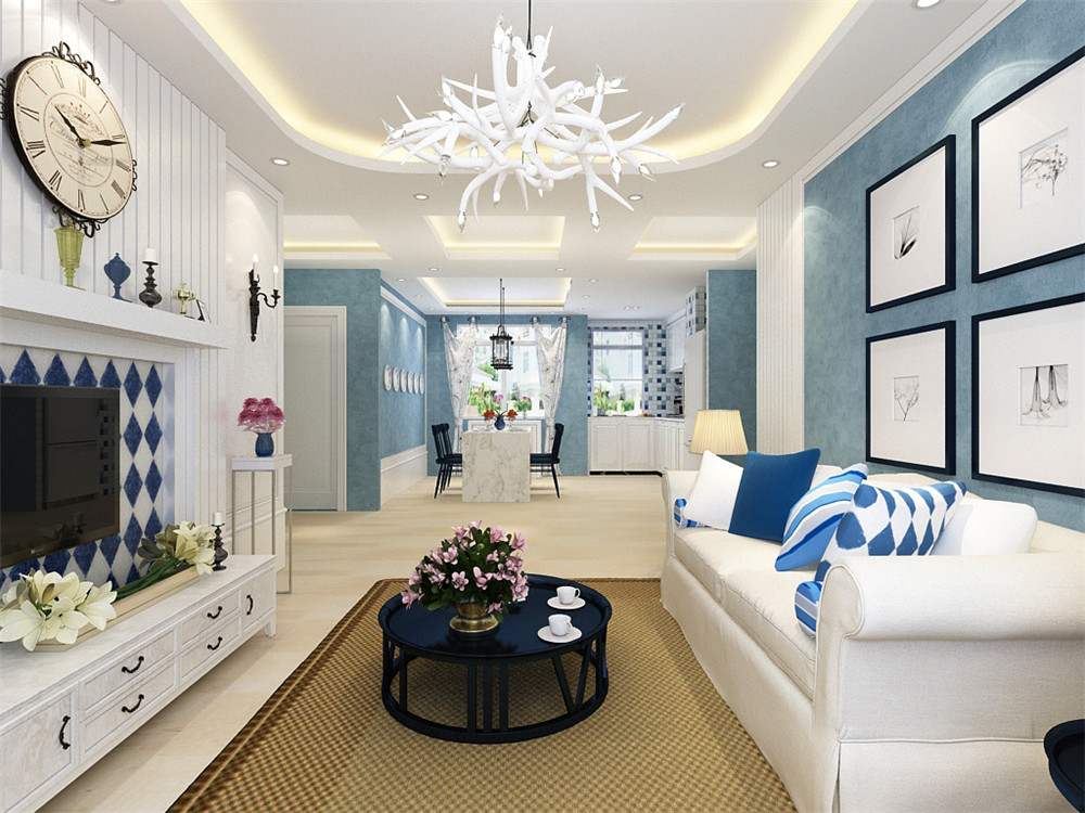 全屋以一種帶灰調(diào)的藍色作為主色調(diào),清新怡人。