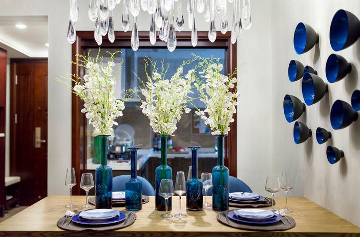 餐廳的墻面裝飾很有意思,深藍(lán)色的小碗既貼合整體的風(fēng)格,也符合餐廳的主題。