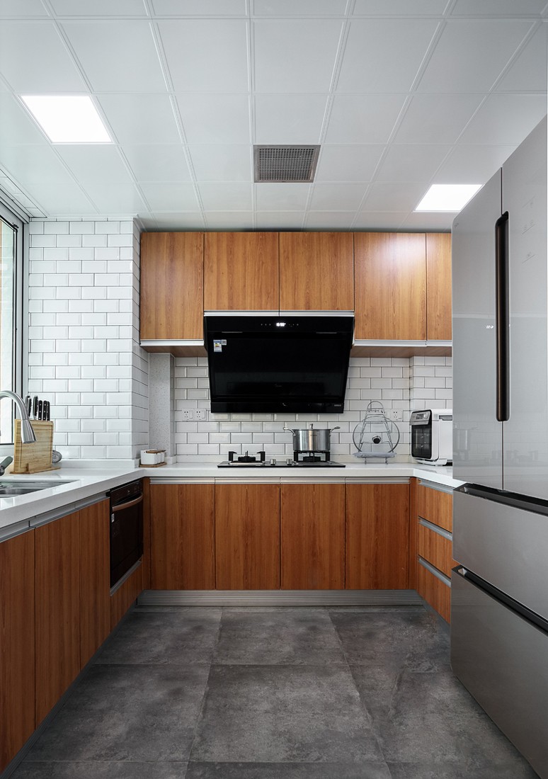設計師重點在于打造一種中式風格寧靜致遠的禪意,所以用淺灰色的布藝沙發(fā)和木質家具搭配在一起,有一種和諧的美感。