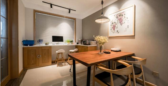 客廳的裝飾簡單雅致,木色與純色的搭配,能夠給人帶來一種靜謐感與舒適感,所以臥室也大量沿用了這一種搭配。餐廳的里邊是一個小型的工作區(qū),射燈集中了光線,方便閱讀和辦公。餐廳兒童房的色彩可以盡量鮮艷多樣一些,有助于激發(fā)小朋友的想象力,但是整體上也不宜跟新中式風格相差太遠。